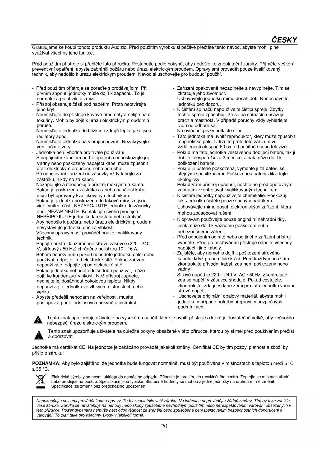 gramofonu USB, spróbuj sprawdzić ustawienia systemowe lub panel sterowania, aby dostosować ustawienia wejścia audio z panelu sterowania dźwiękiem. Uwaga: Załączone oprogramowanie Audacity ma charakter wyłącznie referencyjny. Więcej informacji i najnowszą wersję oprogramowania można znaleźć na stronie internetowej: http://www.audacity.com20 ČESKY Gratulujeme ke koupi tohoto produktu Audizio. Před použitím výrobku si pečlivě přečtěte tento návod, abyste mohli plně využívat všechny jeho funkce. Před použitím přístroje si přečtěte tuto příručku. Postupujte podle pokynů, aby nedošlo ke zneplatnění záruky. Přijměte veškerá preventivní opatření, abyste zabránili požáru nebo úrazu elektrickým proudem. Opravy smí provádět pouze kvalifikovaný technik, aby nedošlo k úrazu elektrickým proudem. Návod si uschovejte pro budoucí použití.