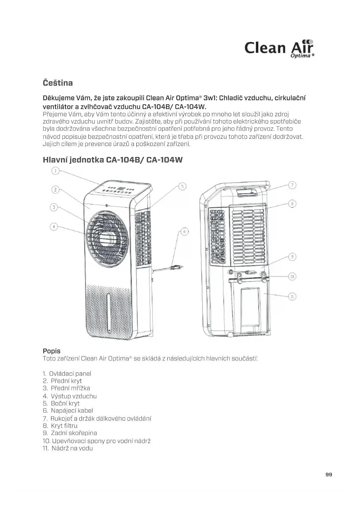 Dekujeme Vám, ze jste zakoupili Clean Air Optima® 3w1: Chladič vzduchu, cirkulační ventilátor a zvlhčovac vzduchu CA-104B/ CA-104W.