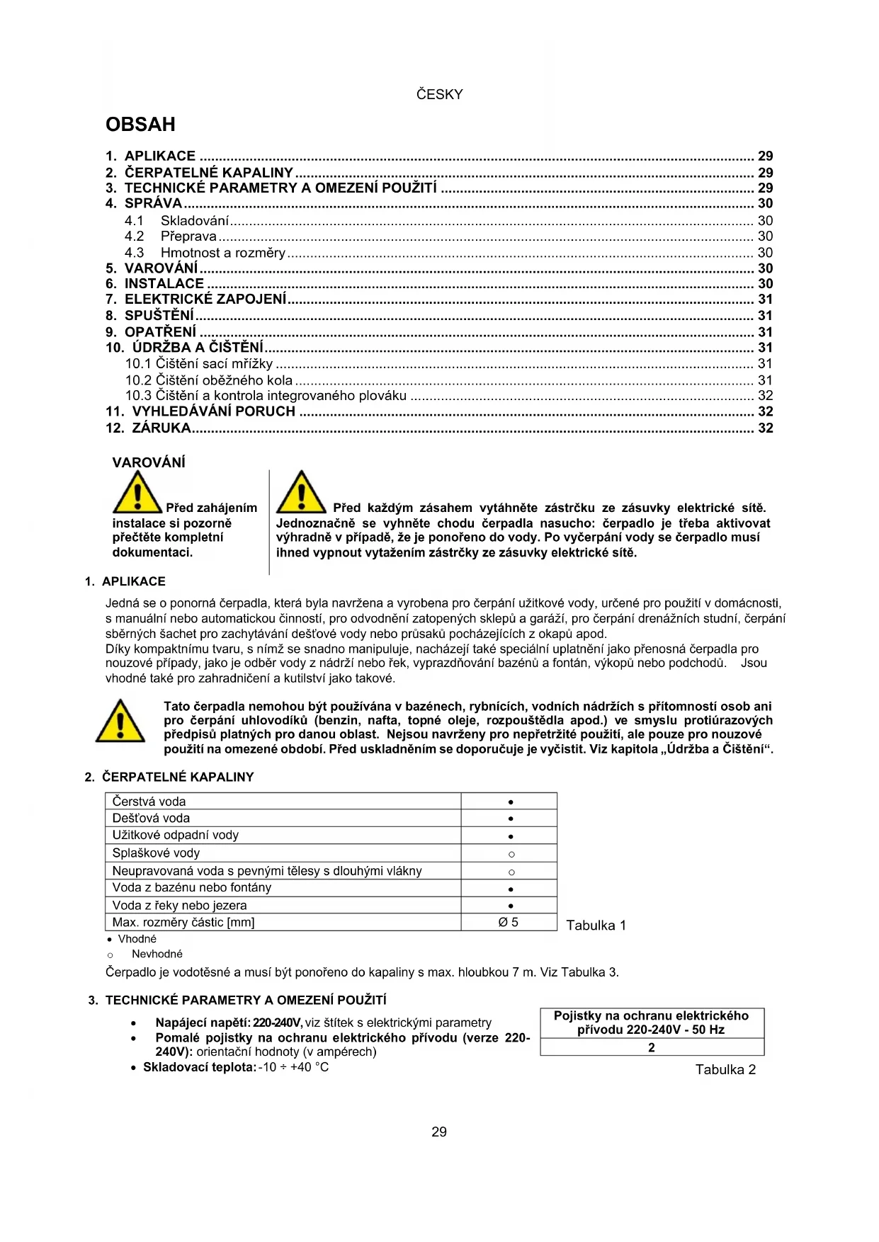 Čerpadlo je vodotěsné a musí být ponořeno do kapaliny s max. hloubkou 7 m. Viz Tabulka 3.