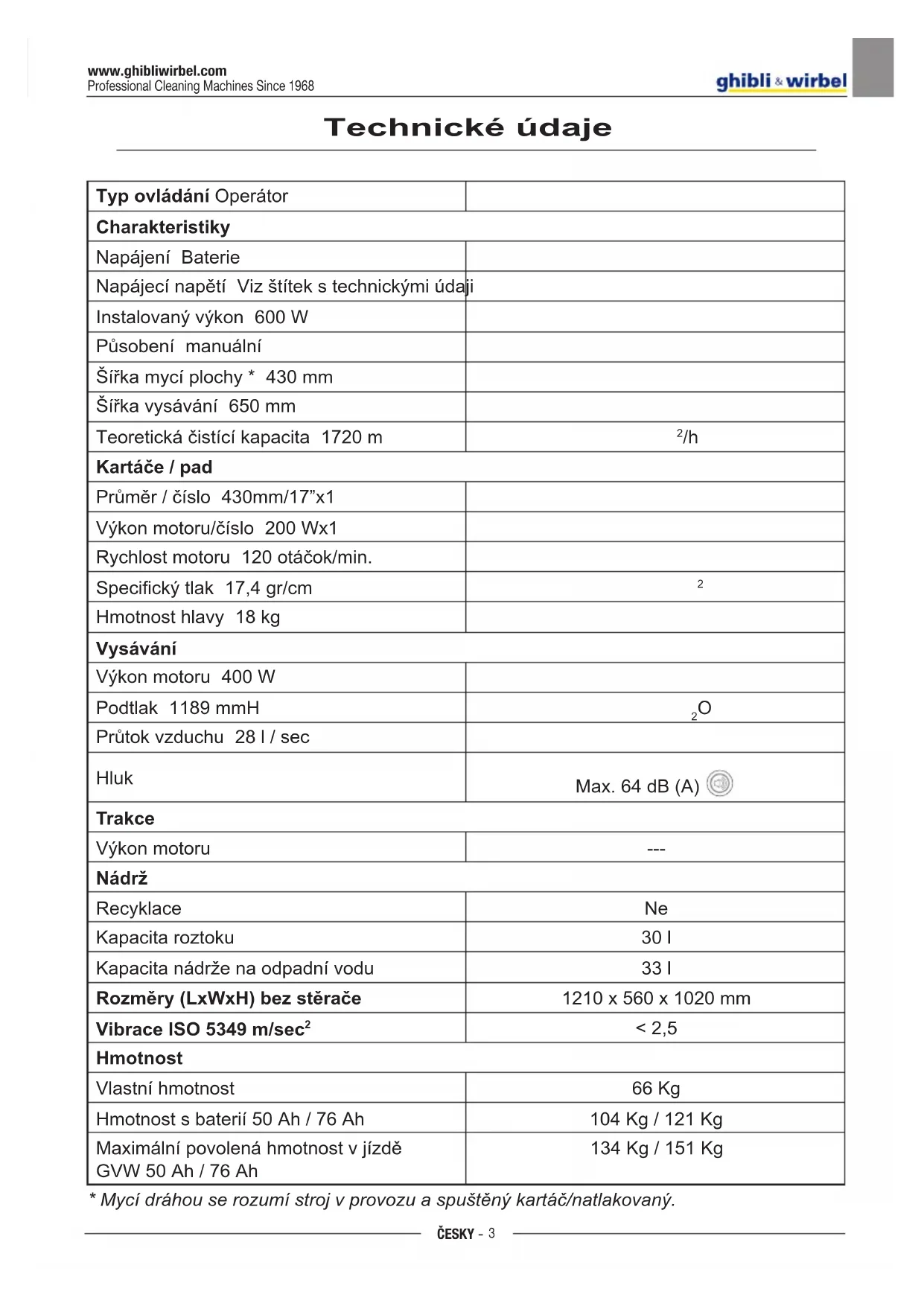 < 2,5 Hmotnost Vlastníhmotnost 66Kg Hmotnostsbaterií50Ah/76Ah 104Kg/121Kg Maximálnípovolenáhmotnostvjízdě GVW50Ah/76Ah 134Kg/151Kg Man_FR30SM45TOUCH_49026500_1ed_02-2018_10L.indd 3 02/03/18 08:47www.ghibliwirbel.com Professional Cleaning Machines Since 1968 ČESKY -