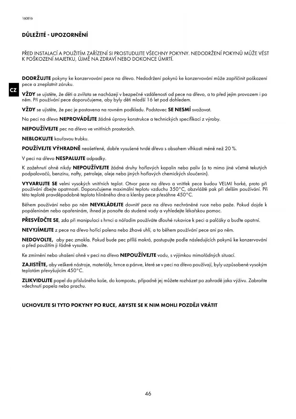 PŘED INSTALACÍ A POUŽITÍM ZAŘÍZENÍ SI PROSTUDUJTE VŠECHNY POKYNY NEDODRŽENÍ POKYNŮ MŮŽE VÉST K POŠKOZENÍ MAJETKU, ÚJMĚ NA ZDRAVÍ NEBO DOKONCE ÚMRTÍ DODRŽUJTE pokyny ke konzervování pece na dřevo Nedodržení pokynů ke konzervování může zapříčinit poškození pece a zneplatnit záruku VŽDY se ujistěte, že děti a zvířata se nacházejí v bezpečné vzdálenosti od pece na dřevo, a to před jejím provozem i po něm Při používání pece doporučujeme, aby byly děti mladší 16 let pod dohledem VŽDY se ujistěte, že pec je postavena na rovném podkladu Podstavec SE NESMÍ svažovat Na peci na dřevo NEPROVÁDĚJTE žádné úpravy konstrukce a technických specifikací z výroby NEPOUŽÍVEJTE pec na dřevo ve vnitřních prostorách NEBLOKUJTE kouřovou trubku POUŽÍVEJTE VÝHRADNĚ neošetřené, dobře vysušené tvrdé dřevo s obsahem vlhkosti méně než 20% V peci na dřevo NESPALUJTE odpadky K zažehnutí ohně nikdy NEPOUŽÍVEJTE žádné druhy hořlavých kapalin nebo paliv (a to mimo jiné včetně tekutých podpalovačů, benzínu, nafty, petroleje, oleje nebo jiných hořlavých chemických sloučenin) VYVARUJTE SE velmi vysokých vnitřních teplot Otvor pece na dřevo a vnitřek pece budou VELMI horké, proto při používání dbejte opatrnosti Doporučujeme maximální teplotu vzduchu 350°C, obzvláště pak při delším používání Při této teplotě pravděpodobně teplota hliněného dna a klenby pece přesáhne 450°C Během používání nebo po něm NEVKLÁDEJTE dovnitř pece na dřevo nechráněné ruce nebo paže Pokud dojde k popáleninám nebo opařeninám, ihned je ponořte do studené vody a vyhledejte lékařskou pomoc PŘESVĚDČTE SE, zda při manipulaci s hrnci a nářadím používáte dlouhé rukavice k peci a palčáky a buďte opatrní NEVYJÍMEJTE z pece na dřevo hořící polena nebo žhavé uhlí, a to během používání pece ani po něm NEDOVOLTE, aby pec zmokla Pokud bude pec příliš mokrá, postupujte podle následujících pokynů ke konzervování a před použitím ji řádně vysušte Ke zmírnění nebo uhašení ohně v peci na dřevo NEPOUŽÍVEJTE vodu, s výjimkou mimořádných situací ZAJISTĚTE, aby veškeré nástroje, materiály, hrnce a pánve, které se v peci na dřevo používají, byly uzpůsobené vysokým teplotám převyšujícím 450°C ZLIKVIDUJTE popel do příslušného koše, do kompostu, případně jej můžete rozházet po zahradě jako výživu Zabraňte vdechnutí popela nebo prachu UCHOVEJTE SI TYTO POKYNY PO RUCE, ABYSTE SE K NIM MOHLI POZDĚJI VRÁTIT