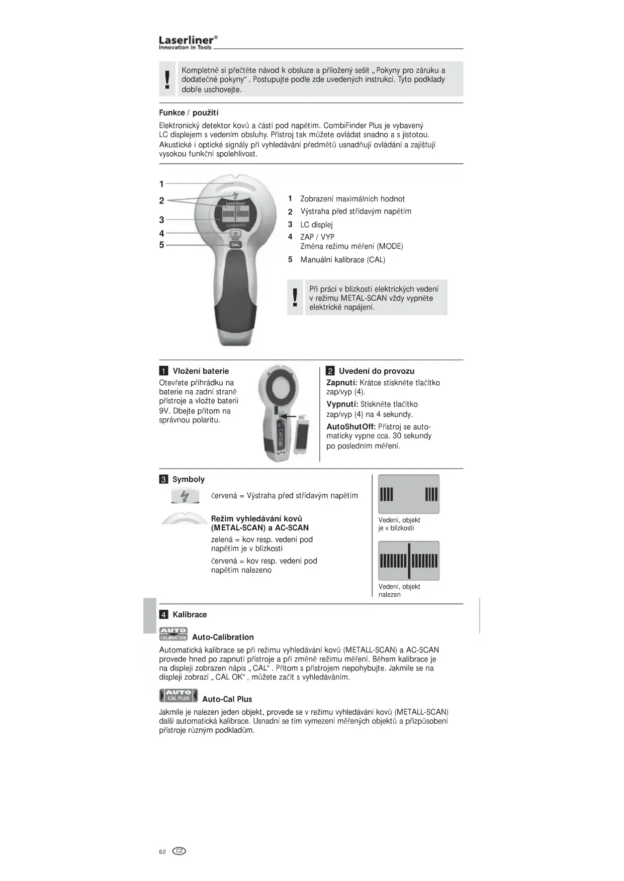 Elektronický detektor kovŶ a ňástí pod napŌtím. CombiFinder Plus je vybavený LC displejem s vedením obsluhy. PŪístroj tak mŶžete ovládat snadno a s jistotou. Akustické i optické signály pŪi vyhledávání pŪedmŌtŶ usnadŢují ovládání a zajišůují vysokou funkňní spolehlivost. Auto-Calibration Automatická kalibrace se pŪi režimu vyhledávání kovŶ (METALL-SCAN) a AC-SCAN provede hned po zapnutí pŪístroje a pŪi zmŌnŌ režimu mŌŪení. BŌhem kalibrace je na displeji zobrazen nápis „CAL“. PŪitom s pŪístrojem nepohybujte. Jakmile se na displeji zobrazí „CAL OK“, mŶžete zaňít s vyhledáváním. Auto-Cal Plus Jakmile je nalezen jeden objekt, provede se v režimu vyhledávání kovŶ (METALL-SCAN) další automatická kalibrace. Usnadní se tím vymezení mŌŪených objektŶ a pŪizpŶsobení pŪístroje rŶzným podkladŶm. Kalibrace ňervená = Výstraha pŪed stŪídavým napŌtím Režim vyhledávání kovŃ (METAL-SCAN) a AC-SCAN zelená = kov resp. vedení pod napŌtím je v blízkosti ňervená = kov resp. vedení pod napŌtím nalezeno Symboly Vedení, objekt je v blízkosti Vedení, objekt nalezen KompletnŌ si pŪeňtŌte návod k obsluze a pŪiložený sešit „Pokyny pro záruku a dodateňné pokyny“. Postupujte podle zde uvedených instrukcí. Tyto podklady dobŪe uschovejte.