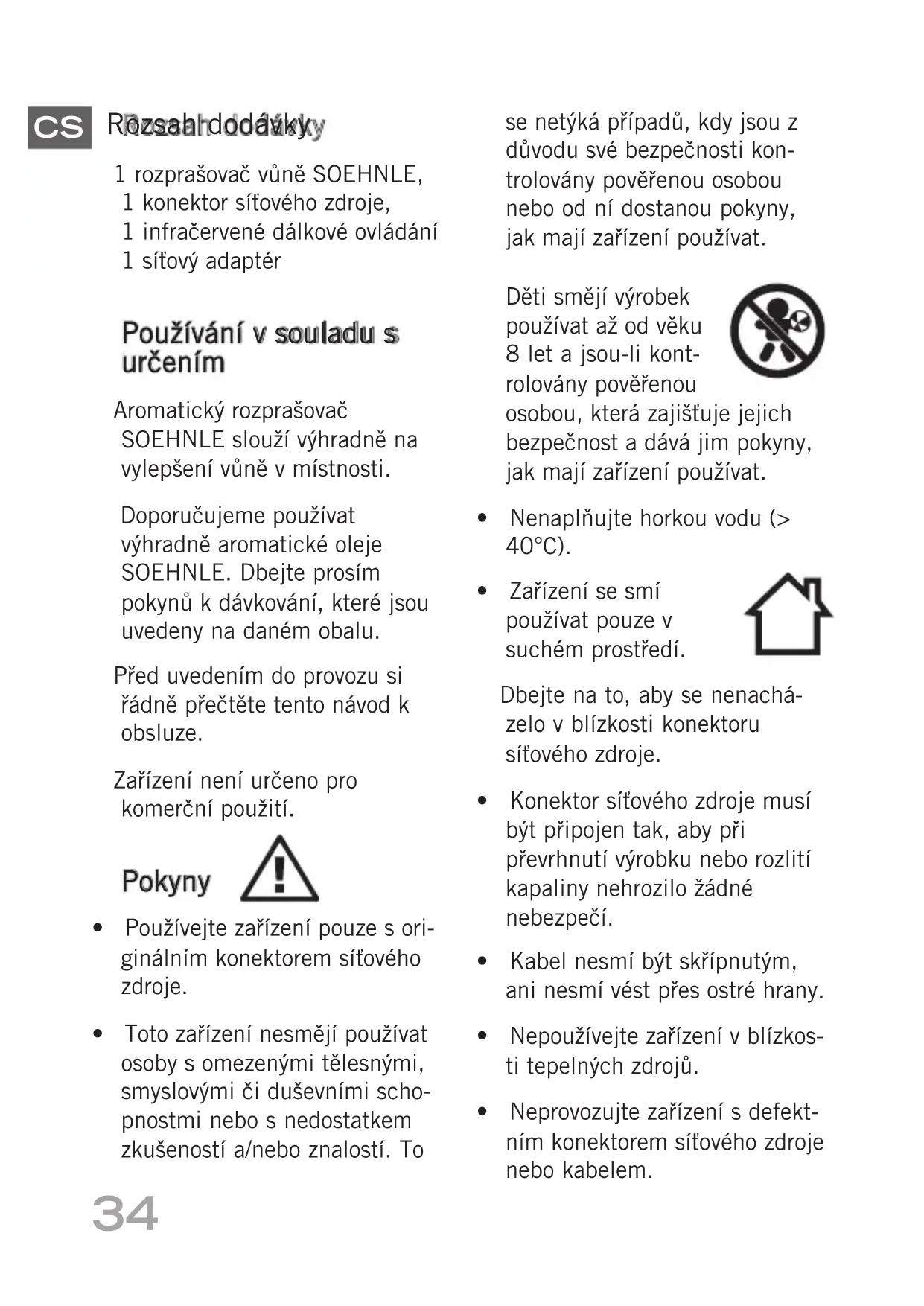 med en fugtig klud. D. Tekniske data Dimensioner: Ø 214 x 126 mm Mærkespænding: 24V⎓ Mærkeeffekt: 10 W Vandindhold: 100 ml Strømforsyning: Model: LQ240050U Indgang: 100-240V~50/60Hz Maks. 0.4 A Udgang: 24V⎓500mA Batterier til fjernbetjening: 2 x 1,5 V str. AAA 68056_Aroma-Diffuser-Milano-plus_010001-A_Content_11-06-2014.indd 33 11.06.2014 07:41:0934 Rozsah dodávky 1 rozprašovač vůně SOEHNLE, 1 konektor síťového zdroje, 1 infračervené dálkové ovládání 1 síťový adaptér Používání v souladu s určením Aromatický rozprašovač SOEHNLE slouží výhradně na vylepšení vůně v místnosti. Doporučujeme používat výhradně aromatické oleje SOEHNLE. Dbejte prosím pokynů k dávkování, které jsou uvedeny na daném obalu. Před uvedením do provozu si řádně přečtěte tento návod k obsluze. Zařízení není určeno pro komerční použití. Pokyny