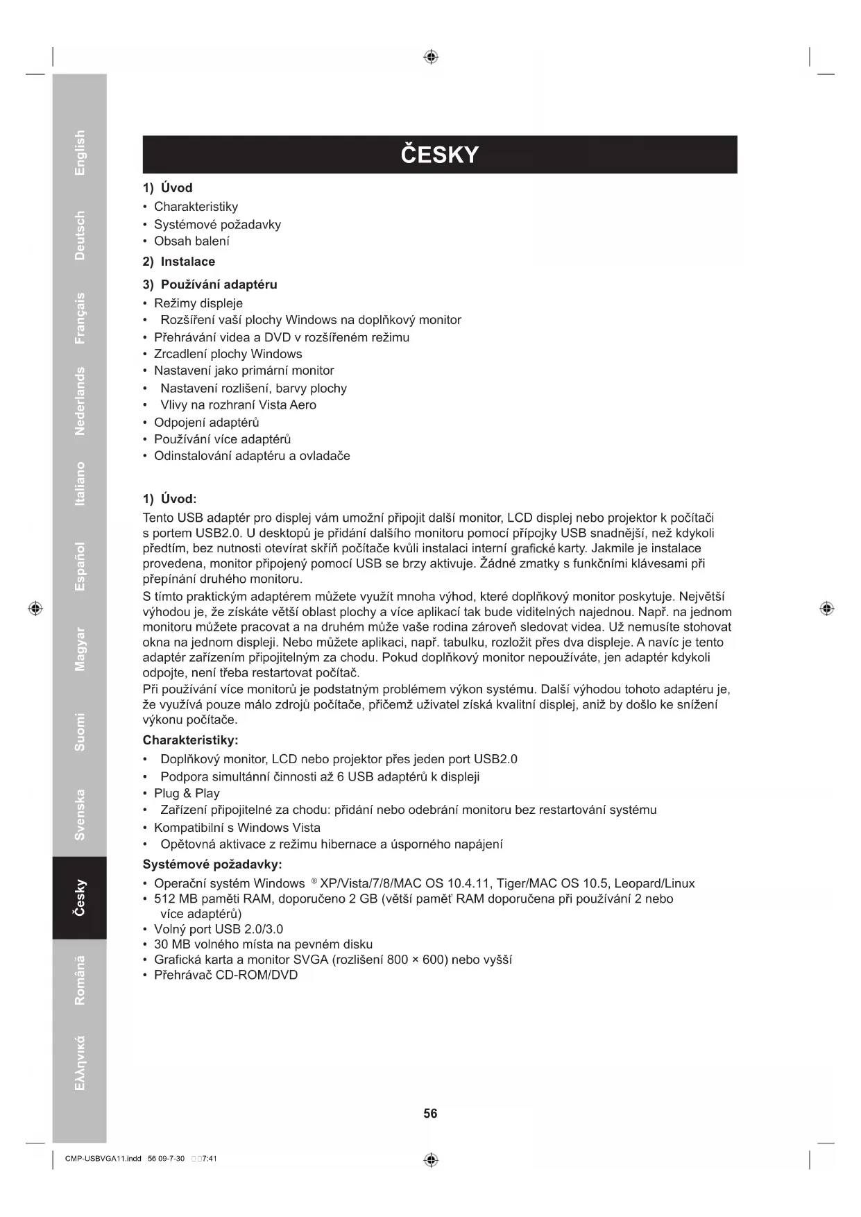 - Přehrávač CD-ROM/DVD EnglishDeutschFrançaisNederlandsItalianoEspañolMagyarSuomiSvenskaČeskyRomânăΕλληνικά CMP-USBVGA11.indd 56 09-7-30 7:4157 Chcete-li přehrávat disky DVD na monitoru připojeném přes adaptér, musí být kromě výše uvedených splněny i následující požadavky:
