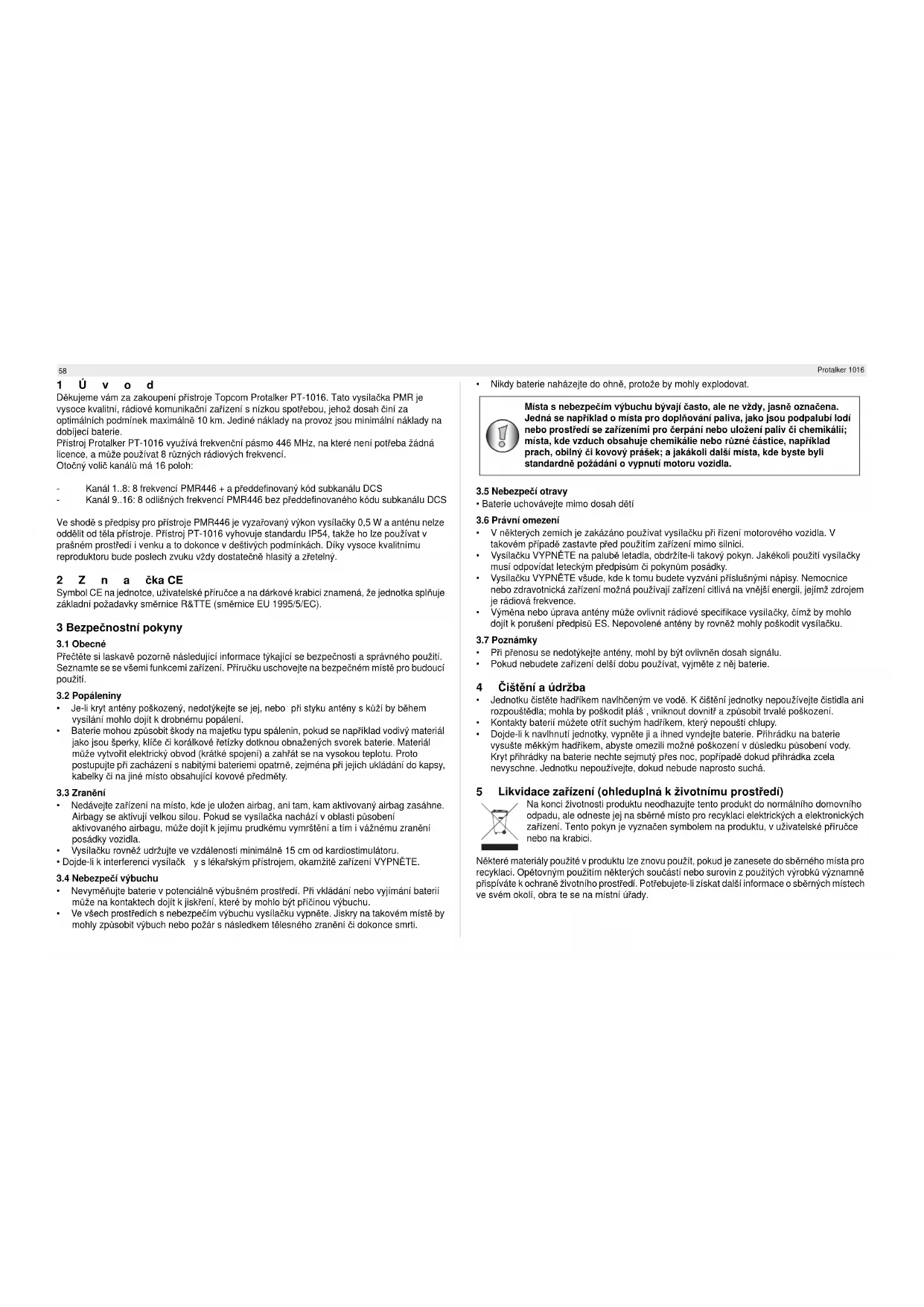 Danos ou defeitos causados pelo tratamento ou operação incorrectos e danos resultantes da utilização de peças ou acessórios não originais não são abrangidos pela garantia. A garantia não cobre danos causados por factores externos, como relâmpagos, água e fogo, nem quaisquer danos causados durante o transporte. Não se poderá reclamar os direitos de garantia se o número de série que se encontra na unidade tiver sido alterado, retirado ou tornado ilegível. Qualquer reclamação de garantia não será válida se a unidade tiver sido reparada, alterada ou modificada pelo comprador. O diagrama no Anexo B mostra como o altifalante/microfone são ligados.58 Protalker 1016 1Úvod Děkujeme vám za zakoupení přístroje Topcom Protalker PT-1016. Tato vysílačka PMR je vysoce kvalitní, rádiové komunikační zařízení s nízkou spotřebou, jehož dosah činí za optimálních podmínek maximálně 10 km. Jediné náklady na provoz jsou minimální náklady na dobíjecí baterie. Přístroj Protalker PT-1016 využívá frekvenční pásmo 446 MHz, na které není potřeba žádná licence, a může používat 8 různých rádiových frekvencí. Otočný volič kanálů má 16 poloh: - Kanál 1..8: 8 frekvencí PMR446 + a předdefinovaný kód subkanálu DCS - Kanál 9..16: 8 odlišných frekvencí PMR446 bez předdefinovaného kódu subkanálu DCS Ve shodě s předpisy pro přístroje PMR446 je vyzařovaný výkon vysílačky 0,5 W a anténu nelze oddělit od těla přístroje. Přístroj PT-1016 vyhovuje standardu IP54, takže ho lze používat v prašném prostředí i venku a to dokonce v deštivých podmínkách. Díky vysoce kvalitnímu reproduktoru bude poslech zvuku vždy dostatečně hlasitý a zřetelný. 2Značka CE Symbol CE na jednotce, uživatelské příručce a na dárkové krabici znamená, že jednotka splňuje základní požadavky směrnice R&TTE (směrnice EU 1995/5/EC). 3 Bezpečnostní pokyny