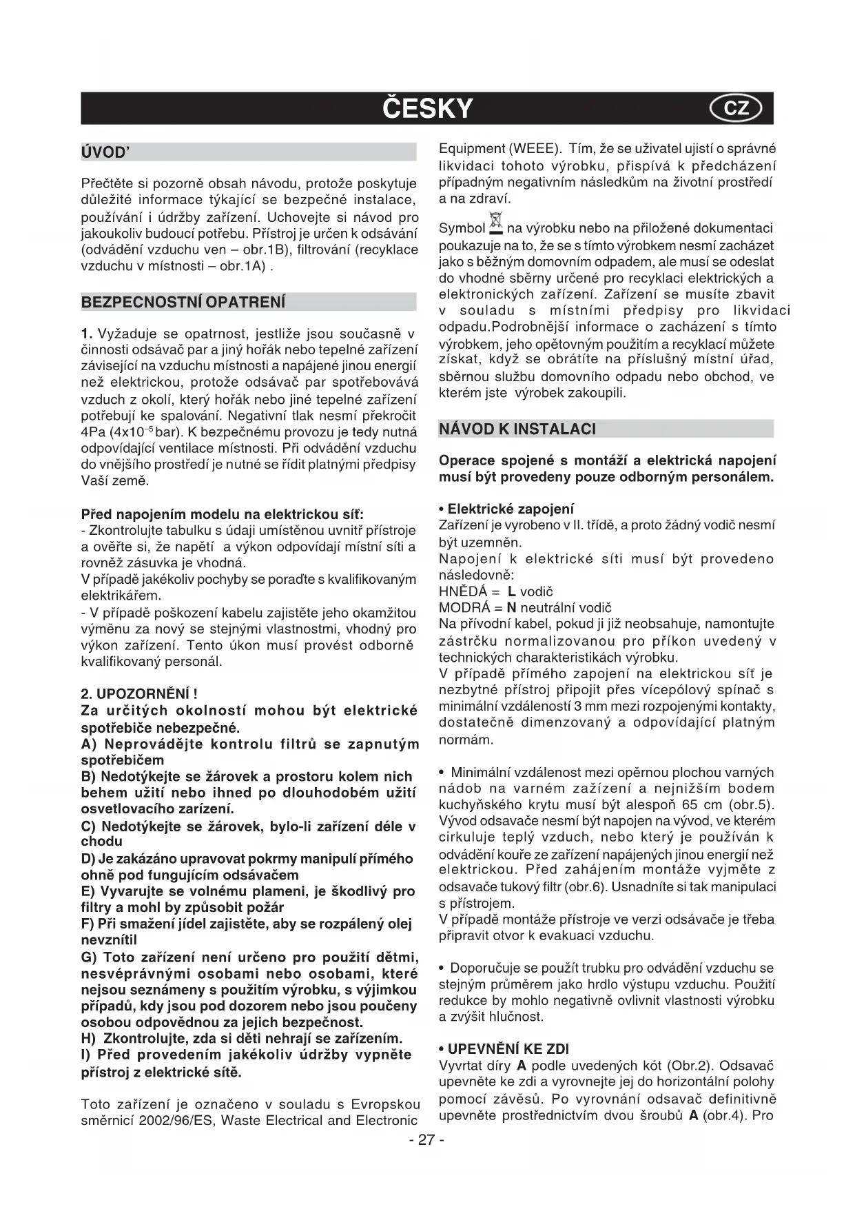 INOBSERVÂNCIA DAS ADVERTÊNCIAS ACIMA.- 27 - ÚVOD’ Přečtěte si pozorně obsah návodu, protože poskytuje důležité informace týkající se bezpečné instalace, používání i údržby zařízení. Uchovejte si návod pro jakoukoliv budoucí potřebu. Přístroj je určen k odsávání (odvádění vzduchu ven – obr.1B), filtrování (recyklace vzduchu v místnosti – obr.1A) . BEZPECNOSTNÍ OPATRENÍ