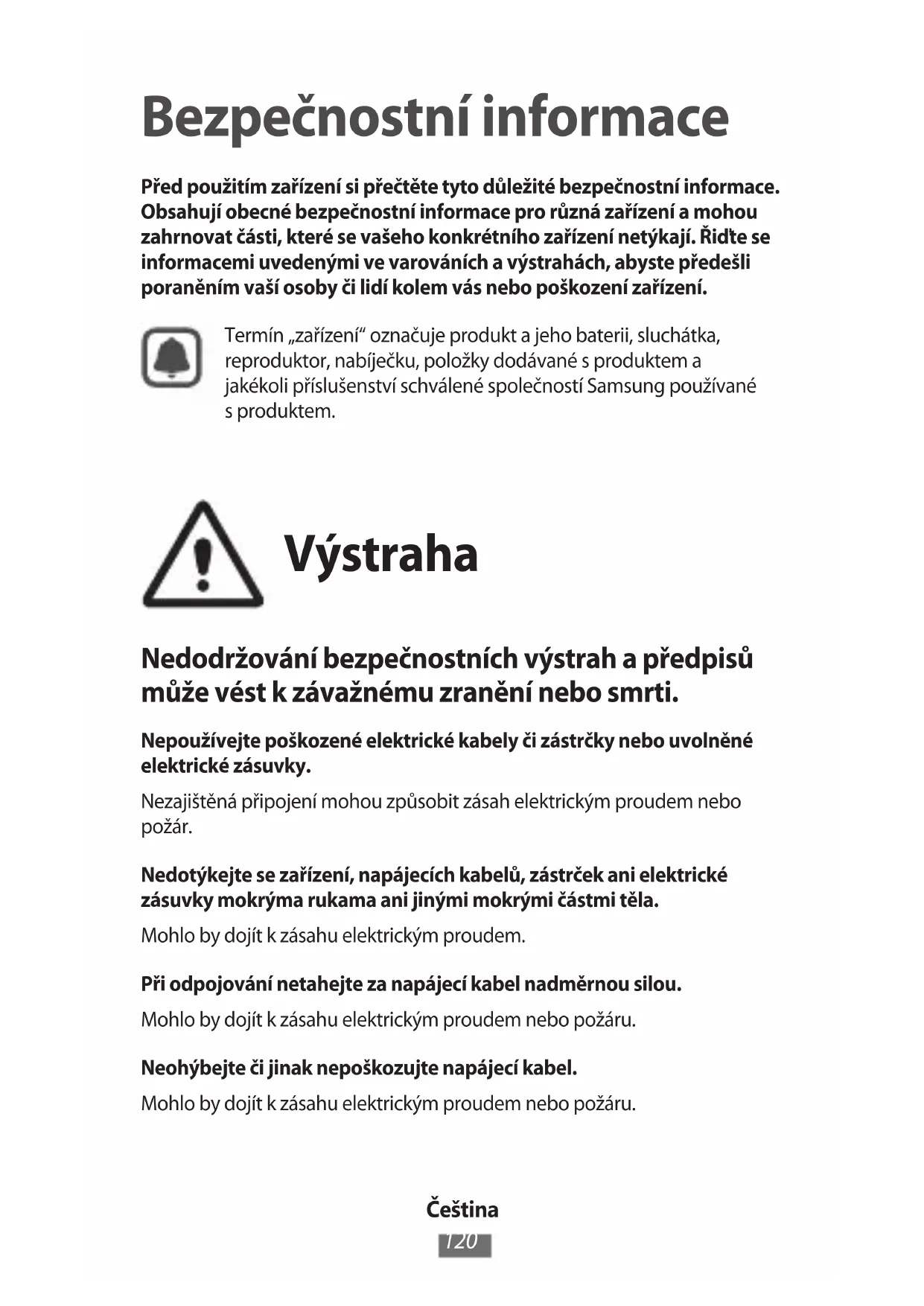 Bezpečnostní informace Před použitím zařízení si přečtěte tyto důležité bezpečnostní informace. Obsahují obecné bezpečnostní informace pro různá zařízení a mohou zahrnovat části, které se vašeho konkrétního zařízení netýkají. Řiďte se informacemi uvedenými ve varováních a výstrahách, abyste předešli poraněním vaší osoby či lidí kolem vás nebo poškození zařízení.Termín „zařízení“ označuje produkt a jeho baterii, sluchátka, reproduktor, nabíječku, položky dodávané s produktem a jakékoli příslušenství schválené společností Samsung používané s produktem. Výstraha Nedodržování bezpečnostních výstrah a předpisů může vést k závažnému zranění nebo smrti. Nepoužívejte poškozené elektrické kabely či zástrčky nebo uvolněné elektrické zásuvky.Nezajištěná připojení mohou způsobit zásah elektrickým proudem nebo požár.Nedotýkejte se zařízení, napájecích kabelů, zástrček ani elektrické zásuvky mokrýma rukama ani jinými mokrými částmi těla.Mohlo by dojít k zásahu elektrickým proudem.Při odpojování netahejte za napájecí kabel nadměrnou silou.Mohlo by dojít k zásahu elektrickým proudem nebo požáru.Neohýbejte či jinak nepoškozujte napájecí kabel.Mohlo by dojít k zásahu elektrickým proudem nebo požáru.Čeština