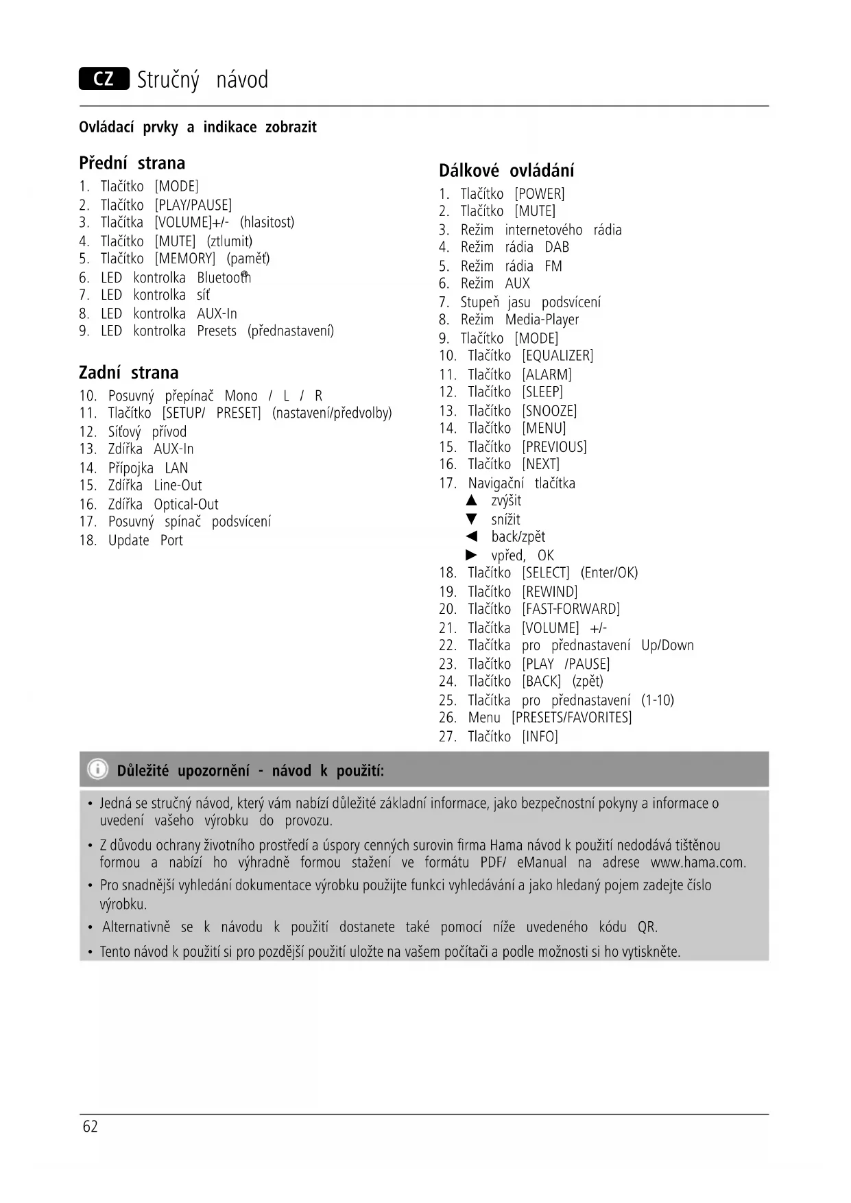 - Z důvodu ochrany životního prostředí a úspory cenných surovin rma Hama návod k použití nedodává tištěnou formou a nabízí ho výhradně formou stažení ve formátu PDF/ eManual na adrese www.hama.com.