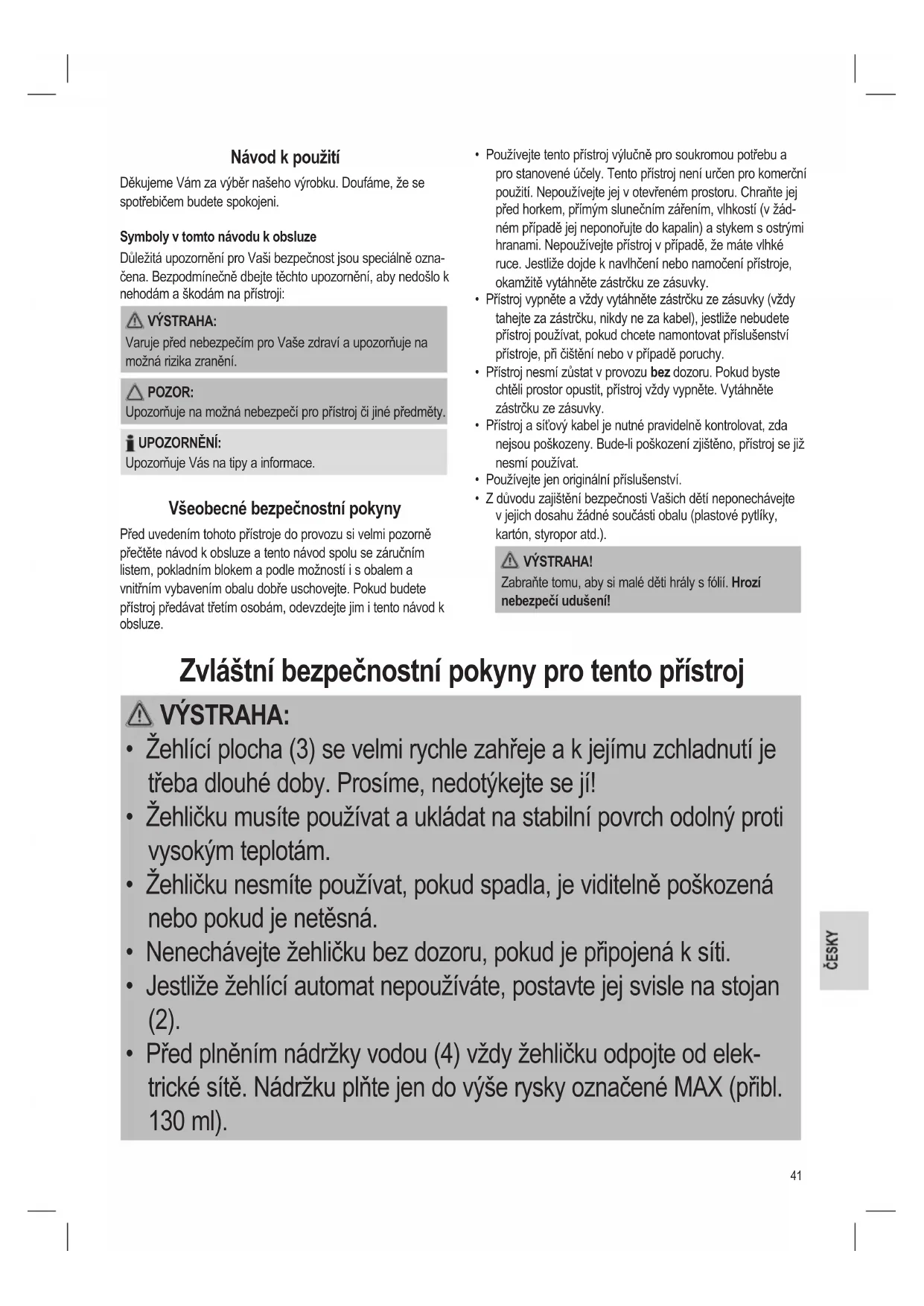 - Z důvodu zajištění bezpečnosti Vašich dětí neponechávejte v jejich dosahu žádné součásti obalu (plastové pytlíky, kartón, styropor atd.). VÝSTRAHA! Zabraňte tomu, aby si malé děti hrály s fólií. Hrozí nebezpečí udušení! Zvláštní bezpečnostní pokyny pro tento přístroj VÝSTRAHA: