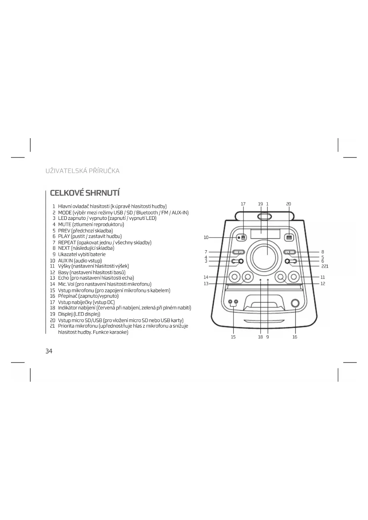 CELKOVÉ SHRNUTÍ Hlavní ovladač hlasitosti (k úpravě hlasitosti hudby) MODE (výběr mezi režimy USB / SD / Bluetooth / FM / AUX-IN) LED zapnuto / vypnuto (zapnutí / vypnutí LED) MUTE (ztlumení reproduktoru) PREV (předchozí skladba) PLAY (pustit / zastavit hudbu) REPEAT (opakovat jednu / všechny skladby) NEXT (následující skladba) Ukazatel vybití baterie AUX IN (audio vstup) Výšky (nastavení hlasitosti výšek) Basy (nastavení hlasitosti basů) Echo (pro nastavení hlasitosti echa) Mic. Vol (pro nastavení hlasitosti mikrofonu) Vstup mikrofonu (pro zapojení mikrofonu s kabelem) Přepínač (zapnuto/vypnuto) Vstup nabíječky (vstup DC) Indikátor nabíjení (červená při nabíjení, zelená při plném nabití) Displej (LED displej) Vstup micro SD/USB (pro vložení micro SD nebo USB karty) Priorita mikrofonu (upřednostňuje hlas z mikrofonu a snižuje hlasitost hudby. Funkce karaoke)