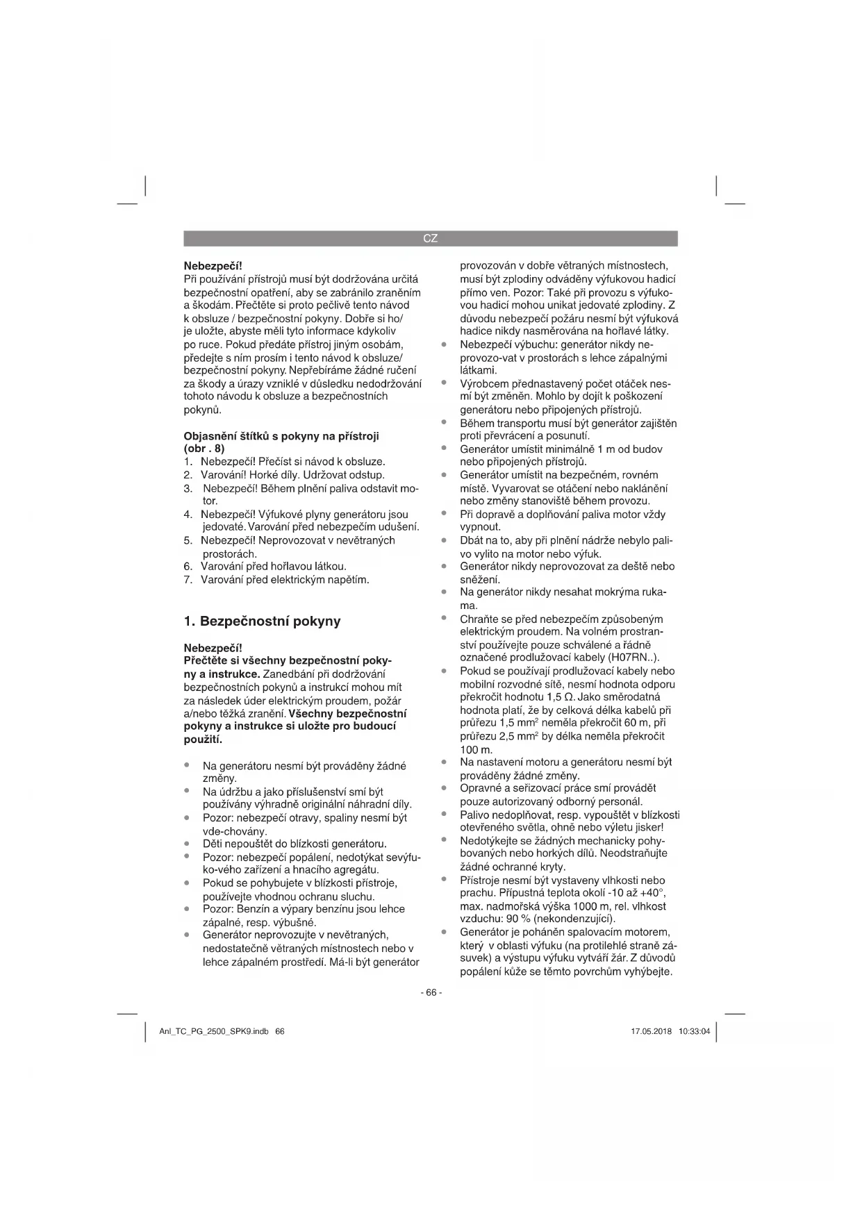 Generátor je poháněn spalovacím motorem, který v oblasti výfuku (na protilehlé straně zá- suvek) a výstupu výfuku vytváří žár. Z důvodů popálení kůže se těmto povrchům vyhýbejte. Anl_TC_PG_2500_SPK9.indb 66Anl_TC_PG_2500_SPK9.indb 66 17.05.2018 10:33:0417.05.2018 10:33:04CZ