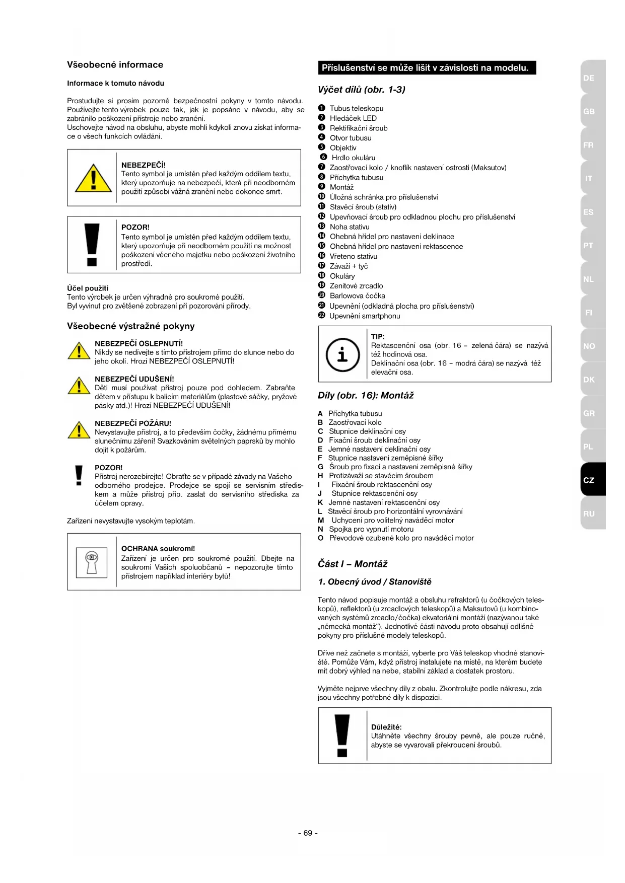 Tento návod popisuje montáž a obsluhu refraktorů (u čočkových teles- kopů), reflektorů (u zrcadlových teleskopů) a Maksutovů (u kombino- vaných systémů zrcadlo/čočka) ekvatoriální montáží (nazývanou také „německá montáž“). Jednotlivé části návodu proto obsahují odlišné pokyny pro příslušné modely teleskopů. Dříve než začnete s montáží, vyberte pro Váš teleskop vhodné stanovi- ště. Pomůže Vám, když přístroj instalujete na místě, na kterém budete mít dobrý výhled na nebe, stabilní základ a dostatek prostoru. Vyjměte nejprve všechny díly z obalu. Zkontrolujte podle nákresu, zda jsou všechny potřebné díly k dispozici. Důležité: Utáhněte všechny šrouby pevně, ale pouze ručně, abyste se vyvarovali překroucení šroubů.- 70 -
