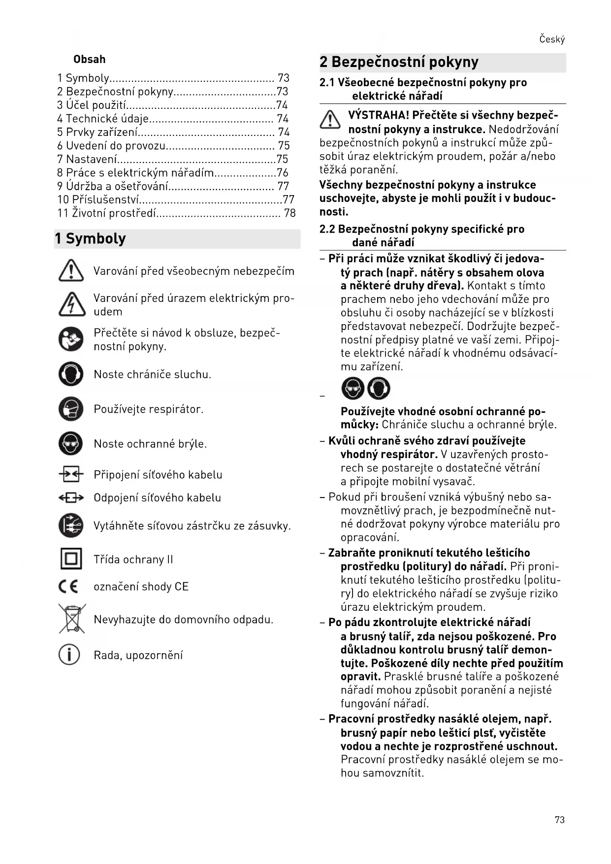 Používejte vhodné osobní ochranné po můcky: Chrániče sluchu aochranné brýle. – Kvůli ochraně svého zdraví používejte vhodný respirátor. Vuzavřených prosto rech se postarejte odostatečné větrání apřipojte mobilní vysavač. – Pokud při broušení vzniká výbušný nebo sa movznětlivý prach, je bezpodmínečně nut né dodržovat pokyny výrobce materiálu pro opracování. – Zabraňte proniknutí tekutého lešticího prostředku (politury) do nářadí. Při proni knutí tekutého lešticího prostředku (politu ry) do elektrického nářadí se zvyšuje riziko úrazu elektrickým proudem. – Po pádu zkontrolujte elektrické nářadí abrusný talíř, zda nejsou poškozené. Pro důkladnou kontrolu brusný talíř demon tujte. Poškozené díly nechte před použitím opravit. Prasklé brusné talíře apoškozené nářadí mohou způsobit poranění anejisté fungování nářadí. – Pracovní prostředky nasáklé olejem, např. brusný papír nebo lešticí plsť, vyčistěte vodou anechte je rozprostřené uschnout. Pracovní prostředky nasáklé olejem se mo hou samovznítit. Český