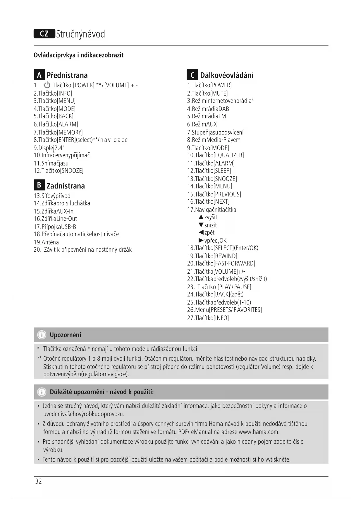 Tlačítka označená *nemají utohoto modelu rádiažádnou funkci. ** Otočné regulátory 1a8mají dvojí funkci. Otáčením regulátoru měníte hlasitost nebo navigaci strukturou nabídky. Stisknutím tohoto otočného regulátoru se přístroj přepne do režimu pohotovosti (regulátor Volume) resp. dojde k potvrzení výběru (regulátor navigace). Důležité upozornění -návod kpoužití: