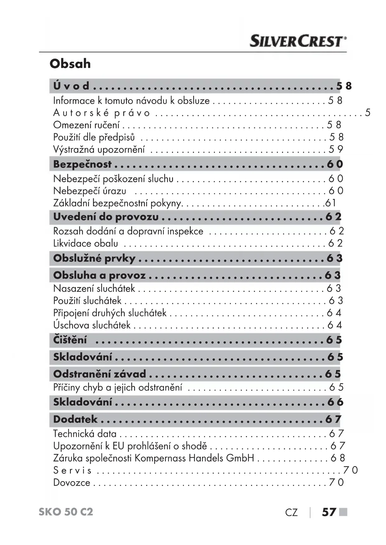 CZ Úvod Informace k tomuto návodu k obsluze Gratulujeme Vám k zakoupení nového přístroje. Vaším nákupem jste si vybrali kvalitní výrobek. Návod k obsluze je součástí tohoto výrobku. Obsahuje důležité pokyny a upozornění ohledně bezpečnosti, použití a likvidace. Před použitím výrobku si dobře přečtěte provozní a bezpečnostní pokyny. Výrobek používejte pouze předepsaným způsobem a v uvedených oblastech použití. Tento návod dobře uschovejte. Při předávání výrobku třetím osobám předávejte i tyto podklady. Autorské právo Tato dokumentace je chráněná autorským právem. Jakékoliv rozmno- žování resp. jakýkoliv dotisk, i zkráceně a reprodukce obrázků, i ve změněném stavu, se dovoluje pouze ze souhlasem výrobce. Omezení ručení Výrobce nepřebírá ručení za škody, vzniklé na základě nedodržení návodu, na základě použití ne dle předpisů, neodborných oprav, nedovoleně provedených změn nebo na základě použití nedovole- ných náhradních dílů. Použití dle předpisů Tato sluchátka jsou přístroj zábavní elektroniky. Jsou určena výlučně pro soukromé použití, pro poslech audiomateriálu. Jiné, než k tomu určené použití, platí jako použití ne podle předpisů. Nároky jakéhokoliv druhu kvůli poškození, které vzniklo na základě neodborného použití, jsou vyloučeny. Riziko nese sám v plném rozsahu provozovatel.SKO 50 C2 CZ