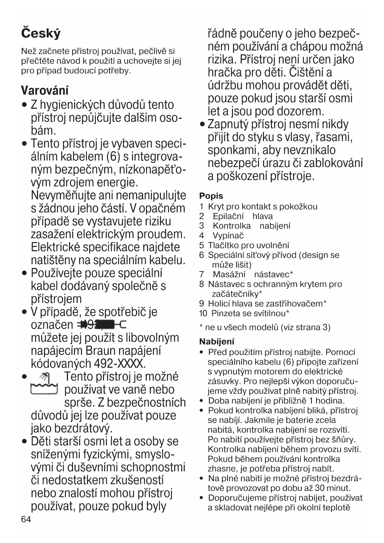 Zapnutý přístroj nesmí nikdy přijít do styku s vlasy, řasami, sponkami, aby nevznikalo nebezpečí úrazu či zablokování a poškození přístroje. Popis 1 Kryt pro kontakt s pokožkou 2 Epilační hlava 3 Kontrolka nabíjení 4 Vypínač 5 Tlačítko pro uvolnění 6 Speciální síťový přívod (design se může lišit) 7 Masážní nástavec* 8 Nástavec s ochranným krytem pro začátečníky* 9 Holicí hlava se zastřihovačem* 0 Pinzeta se svítilnou*