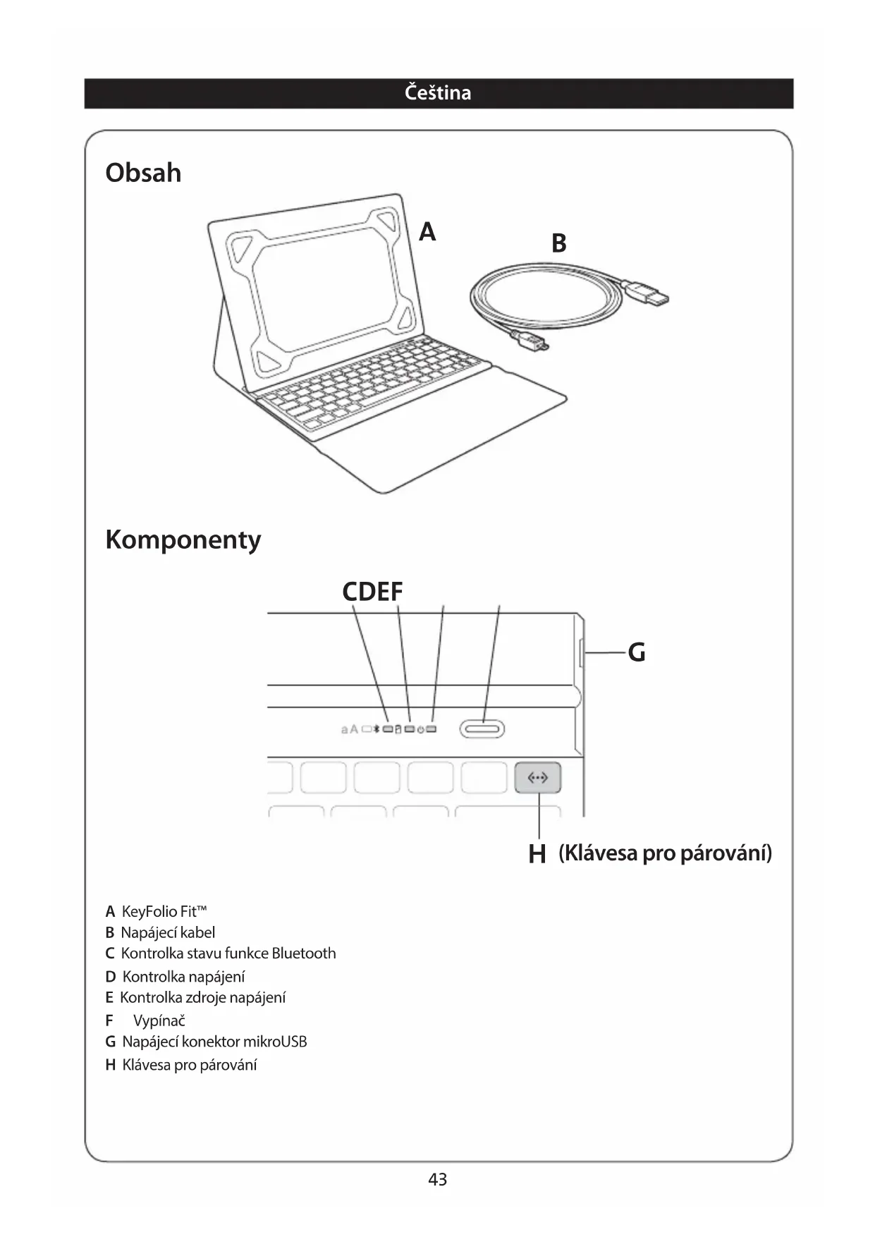 - Před použitím vyrobku KeyFolio zkontrolujte, zda není vyrobek āi některý z kabelů poškozen. Jakékoli poskozené současti nechejte prěd použitím vyměnit nebo opravit.