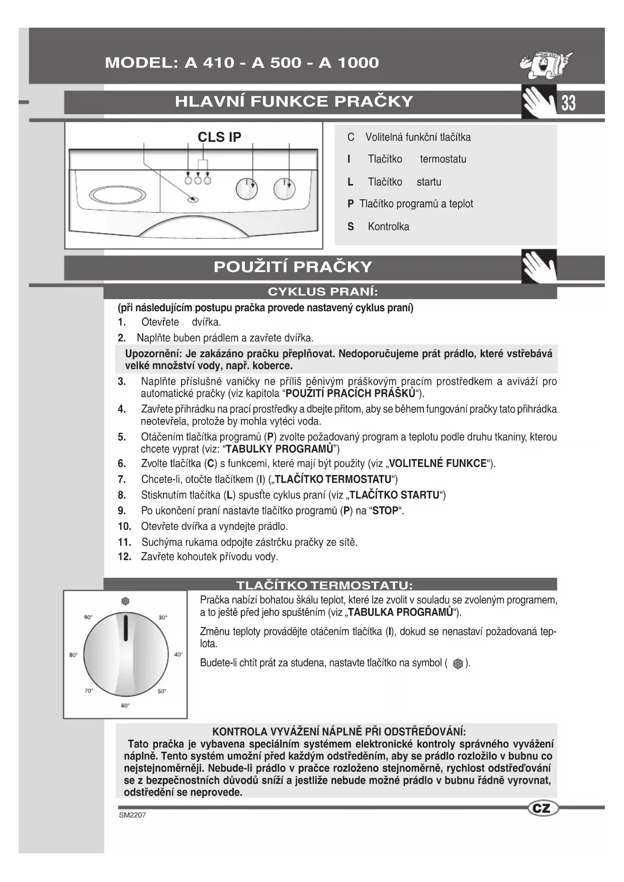 STOP KONTROLKA: Když je tlačítko programů nastaveno v poloze STOP, kontrolka je zhasnuta. Během provádění programu kontrolka stále svítí. Po ukončení programu kontrolka pomalu bliká.„STOP“ NA TLAČÍTKU PROGRAMŮ: VOLITELNÉ FUNKCE Stisknutím tohoto tlačítka se provede krátké praní (zhruba 10 minut) při maximální tep- lotě 40°C. Tato funkce může být použita pouze u programů „BAVLNA“,“SYNTETIKA“ a ”DAILY”.Pozn. Při použití této funkce je třeba pracím práškem naplnit i příslušnou vaničku předpírání.PŘEDPÍRÁNÍ:Funkce stop provádí reset pračky. Kdybyste v průběhu cyklu praní chtěli z jakéhokoliv důvodu tento program změnit nebo kdybyste chtěli do pračky přidat další prádlo, stačí jednoduše nastavit tlačítko programů do polohy „STOP“, poté jej nastavit na požadovaný program a stisknout tlačítko „START“.Upozornění!! Doporučujeme používat tuto funkci pouze v nezbytně nutných případech a pouze za předpokladu, že se program, který má být resetován, spustil ne víc než před třemi minutami. Před otevřením dvířek po resetování je třeba počkat dvě minuty, aby došlo k jejich odblokování.Stlačením tohoto tlačítka pračka spustí cyklus praní.VYLOUČENÍ ODSTŘEĎOVÁNÍStisknutím této funkce pračka provede cyklus praní bez odstřeďování.Pozn. Používání volitelných funkcí závisí na typu použitého programu, tj. jestliže nějaká funkce není povolena programem, nelze aktivovat její tlačítko (viz TABULKA PROGRAMŮ).TLAČÍTKO STARTU:35 SM2207 TABULKY PROGRAMŮ