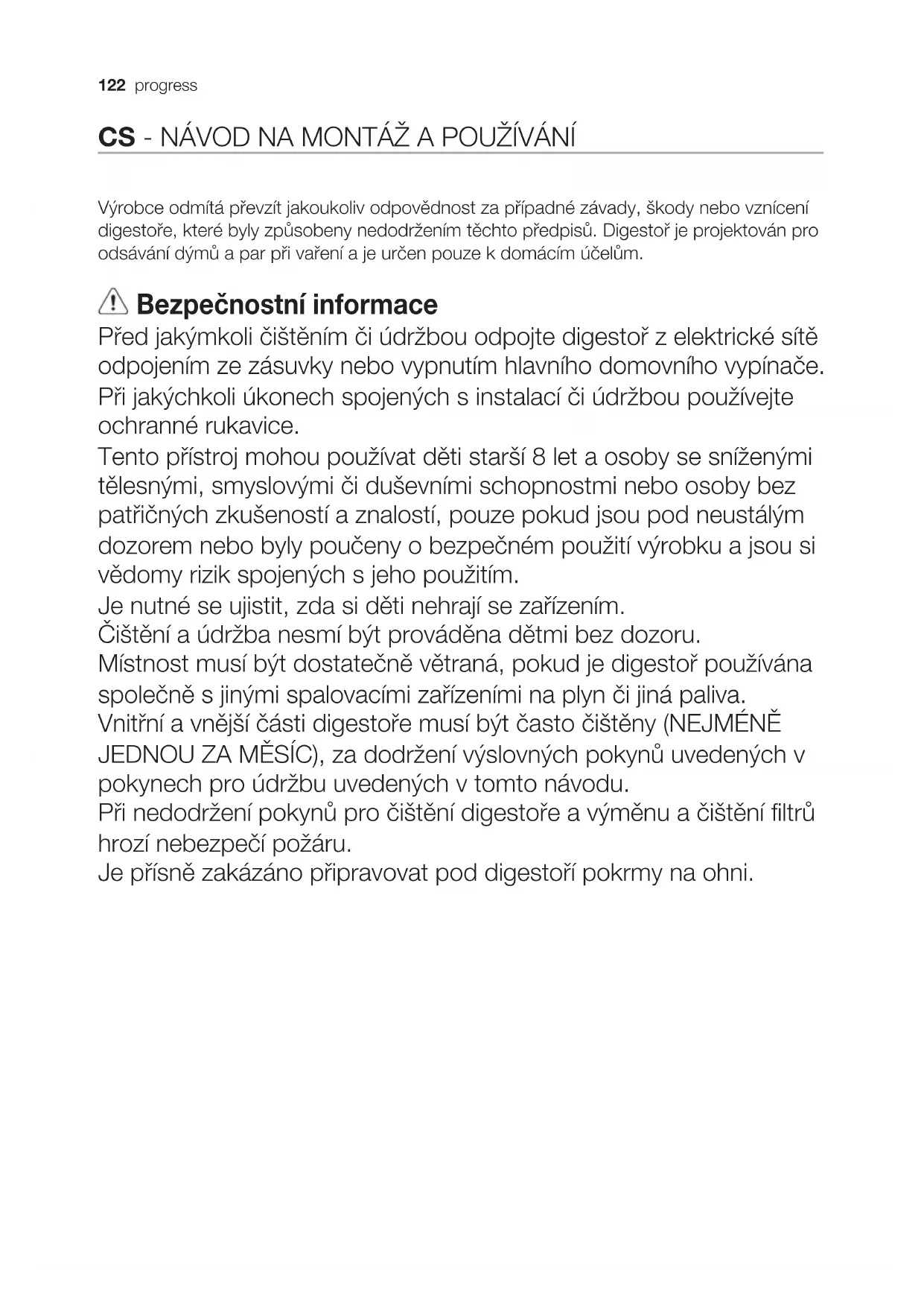 Odsávač pár disponuje funkciou bezdrôtového pripojenia (wireless) s varnou doskou na automatickú reguláciu najvhodnejšej rýchlosti. Dostupnosť a kompatibilitu tejto funkcie si skontrolujte v návode na používanie. V prípade prvého pripojenia k elektrickej sieti alebo náhodného prerušenia elektrického pripojenia (výpadok prúdu) počkajte 1 minútu, aby odsávač pár obnovil pripojenie s varnou doskou. Osvetlenie Odsávač pary je vybavený systémom osvetlenia založenom na technoloógii LED. Kontrolky LED zaručujú optimálne osvetlenie, trvanie až 10 krát dhlhšie ako tradičné žiarovky a umožňujú ušetriť 90% elektrickej energie. Pozor! Nepozerajte sa priamo do svetla kontroliek LED. Pre výmenu lámp kontaktujte autorizované servisné stredisko náhradných dielov.122 progress CS NÁVOD NA MONTÁŽ A POUŽÍVÁNÍ Výrobce odmítá převzít jakoukoliv odpovědnost za případné závady, škody nebo vznícení digestoře, které byly způsobeny nedodržením těchto předpisů. Digestoř je projektován pro odsávání dýmů a par při vaření a je určen pouze k domácím účelům. Bezpečnostní informace Před jakýmkoli čištěním či údržbou odpojte digestoř z elektrické sítě odpojením ze zásuvky nebo vypnutím hlavního domovního vypínače. Při jakýchkoli úkonech spojených s instalací či údržbou používejte ochranné rukavice. Tento přístroj mohou používat děti starší 8 let a osoby se sníženými tělesnými, smyslovými či duševními schopnostmi nebo osoby bez patřičných zkušeností a znalostí, pouze pokud jsou pod neustálým dozorem nebo byly poučeny o bezpečném použití výrobku a jsou si vědomy rizik spojených s jeho použitím. Je nutné se ujistit, zda si děti nehrají se zařízením. Čištění a údržba nesmí být prováděna dětmi bez dozoru. Místnost musí být dostatečně větraná, pokud je digestoř používána společně s jinými spalovacími zařízeními na plyn či jiná paliva. Vnitřní a vnější části digestoře musí být často čištěny (NEJMÉNĚ JEDNOU ZA MĚSÍC), za dodržení výslovných pokynů uvedených v pokynech pro údržbu uvedených v tomto návodu. Při nedodržení pokynů pro čištění digestoře a výměnu a čištění filtrů hrozí nebezpečí požáru. Je přísně zakázáno připravovat pod digestoří pokrmy na ohni.progress 123 Bezpečnostní pokyny Použití otevřeného ohně může poškodit filtry a způsobit požáry, proto oheň nesmí být nikdy používán. Zvýšenou pozornost je nutné věnovat smažení, protože přehřátý olej by se mohl vznítit. Pozor! Pokud je varná deska v provozu, přístupné části digestoře se mohou stát velmi teplými. Při výměně žárovky používejte pouze typ žárovky uvedený v tomto návodu, v části věnované údržbě/výměně žárovek. Pozor! Nepřipojujte přístroj k elektrické síti, dokud instalace nebude zcela ukončena. Co se týče technických a bezpečnostních opatření pro odvod kouře, postupujte přesně podle předpisů příslušných místních orgánů. Odsávaný vzduch musí být odváděn do potrubí používaného pro odtah kouřů vznikajících při použití spalovacích zařízení na plyn či jiná paliva. Nepoužívejte a nenechávejte digestoř bez správně instalovaných žárovek, jelikož hrozí nebezpečí úrazu elektrickým proudem. Nikdy nepoužívejte digestoř bez správně namontované mřížky! Digestoř nesmí být NIKDY používána jako opěrná plocha, pokud pro tento účel není výslovně určena. Při instalaci používejte pouze úchytné šrouby dodané z výrobkem. Pokud šrouby nejsou součástí vybavení, zakupte správný typ šroubů. Používejte šrouby se správnou délkou, podle pokynů v Návodu pro instalaci. V případě pochyb se obraťte na pověřený servis nebo se poraďte s odborným personálem. Pozor! V případě chybějící instalace šroubů a úchytných prvků dle pokynů uvedených v tomto návodu může dojít k vzniku nebezpečí elektrické povahy. Poznámky k ochraně životní ho prostředí Recyklujte materiály označené symbolem . Obaly vyhoďte do příslušných odpadních kontejnerů k recyklaci. Pomáhejte chránit životní prostředí a lidské zdraví a recyklovat elektrické a elektronické spotřebiče určené k likvidaci. Spotřebiče označené příslušným symbolem nelikvidujte spolu s domovním odpadem. Spotřebič odevzdejte v místním sběrném dvoře nebo kontaktujte místní úřad. Použití Digestoř je projektována k použití v odsávací verzi s vnějším vývodem anebo ve filtrující verzi s vnitřním čištěním vzduchu . Instalace Síťové napětí musí odpovídat napětí uvedenému na štítku s charakteristikamii umístěnému uvnitř krytu. Pokud je kryt vybaven přípojkou, stačí jej zapojit do zásuvky odpovídající stávajícím normám, která se nachází ve snadno dosažitelném prostoru i po provedené montáži. Pokud kryt není vybaven přípojkami (přímé připojení k síti) nebo se zásuvka nenachází ve snadno dosažitelném prostoru i po provedené montáži , je třeba použít dvojpólový vypínač odpovídající normám, který zaručí úplné odpojení od sítě v podmínkách kategorie přepětí III, v souladu s pravidly instalace. Pozor! Dříve než opět napojíte obvod digestoře na síťové napájení a ověříte správné fungování, zkontrolujte si vždy, že síťový kabel byl správně namontován.124 progress Minimální vzdálenost mezi podporou nádoby na varné ploše a nejnižší částí digestoře nesmí být menší než 50cm v případě elektrických sporáků 65cm v případě plynových či smíšených sporáků. Pokud návod na instalaci varného zařízení na plyn doporučují větší vzdálenost, je třeba se tímto pokynem řídit. Údržba Pozor! Před jakoukoliv operací čištění č
