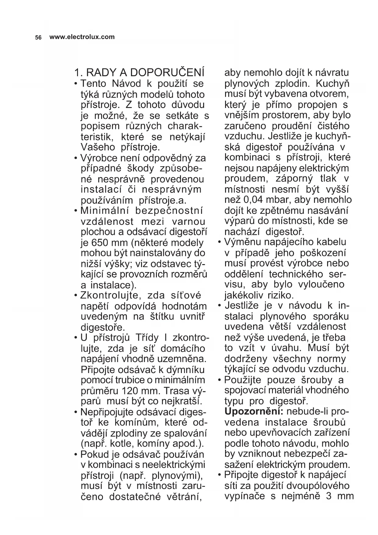 - Připojte digestoř k napájecí síti za použití dvoupólového vypínače s nejméně 3 mm57 CZECH vzdáleností mezi kontakty.