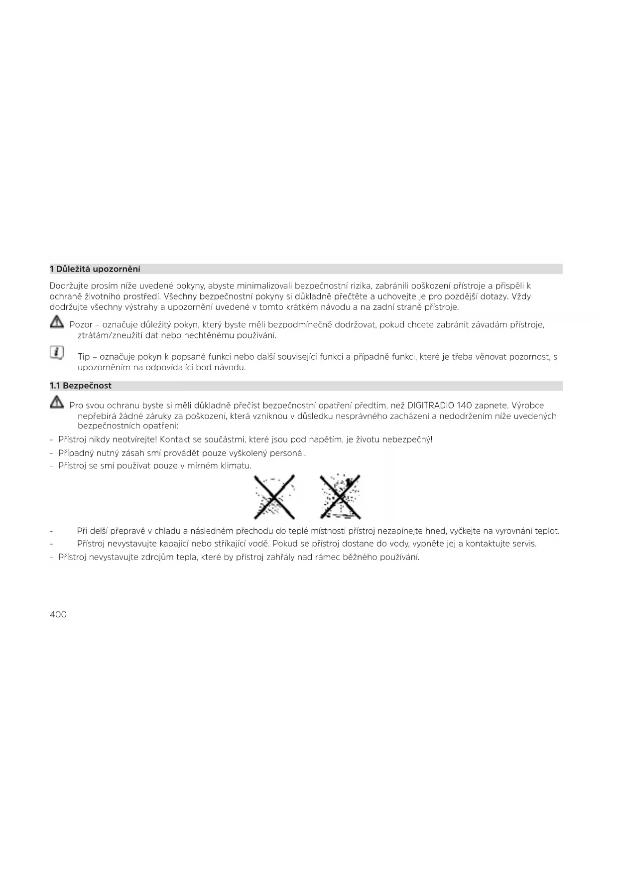 Pro svou ochranu byste si měli důkladně přečíst bezpečnostní opatření předtím, než DIGITRADIO 140 zapnete. Výrobce nepřebírá žádné záruky za poškození, která vzniknou v důsledku nesprávného zacházení a nedodržením níže uvedených bezpečnostních opatření: - Přístroj nikdy neotvírejte! Kontakt se součástmi, které jsou pod napětím, je životu nebezpečný! - Případný nutný zásah smí provádět pouze vyškolený personál. - Přístroj se smí používat pouze v mírném klimatu. - Při delší přepravě v chladu a následném přechodu do teplé místnosti přístroj nezapínejte hned, vyčkejte na vyrovnání teplot. - Přístroj nevystavujte kapající nebo stříkající vodě. Pokud se přístroj dostane do vody, vypněte jej a kontaktujte servis. - Přístroj nevystavujte zdrojům tepla, které by přístroj zahřály nad rámec běžného používání.401