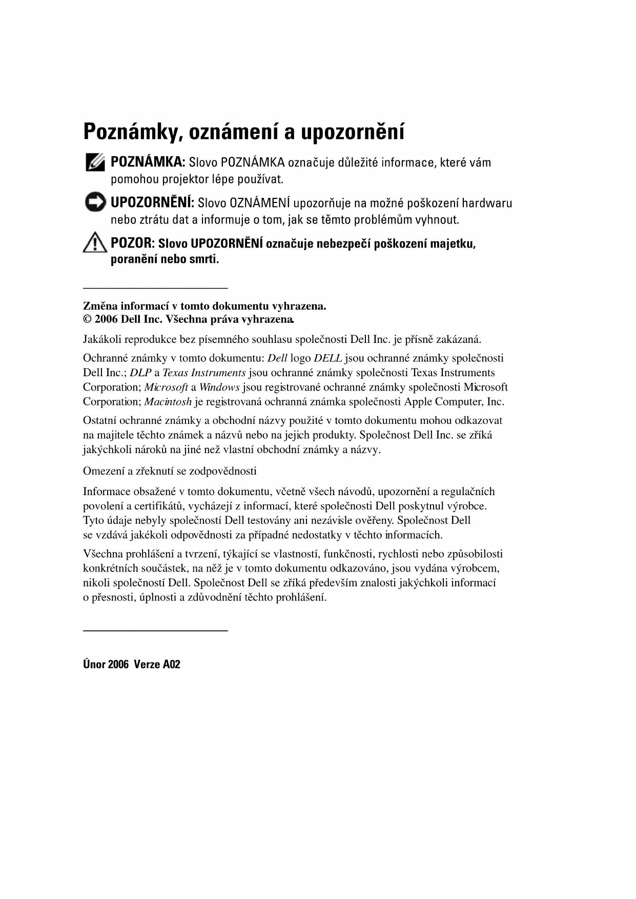 Změna informací v tomto dokumentu vyhrazena. © 2006 Dell Inc. Všechna práva vyhrazena. Jakákoli reprodukce bez písemného souhlasu společnosti Dell Inc. je přísně zakázaná. Ochranné známky v tomto dokumentu: Dell logo DELL jsou ochranné známky společnosti Dell Inc.; DLP a Texas Instruments jsou ochranné známky společnosti Texas Instruments Corporation; Microsoft a Windows jsou registrované ochranné známky společnosti Microsoft Corporation; Macintosh je registrovaná ochranná známka společnosti Apple Computer, Inc. Ostatní ochranné známky a obchodní názvy použité v tomto dokumentu mohou odkazovat na majitele těchto známek a názvů nebo na jejich produkty. Společnost Dell Inc. se zříká jakýchkoli nároků na jiné než vlastní obchodní známky a názvy. Omezení a zřeknutí se zodpovědnosti Informace obsažené v tomto dokumentu, včetně všech návodů, upozornění a regulačních povolení a certifikátů, vycházejí z informací, které společnosti Dell poskytnul výrobce. Tyto údaje nebyly společností Dell testovány ani nezávisle ověřeny. Společnost Dell se vzdává jakékoli odpovědnosti za případné nedostatky v těchto informacích. Všechna prohlášení a tvrzení, týkající se vlastností, funkčnosti, rychlosti nebo způsobilosti konkrétních součástek, na něž je v tomto dokumentu odkazováno, jsou vydána výrobcem, nikoli společností Dell. Společnost Dell se zříká především znalosti jakýchkoli informací o přesnosti, úplnosti a zdůvodnění těchto prohlášení.