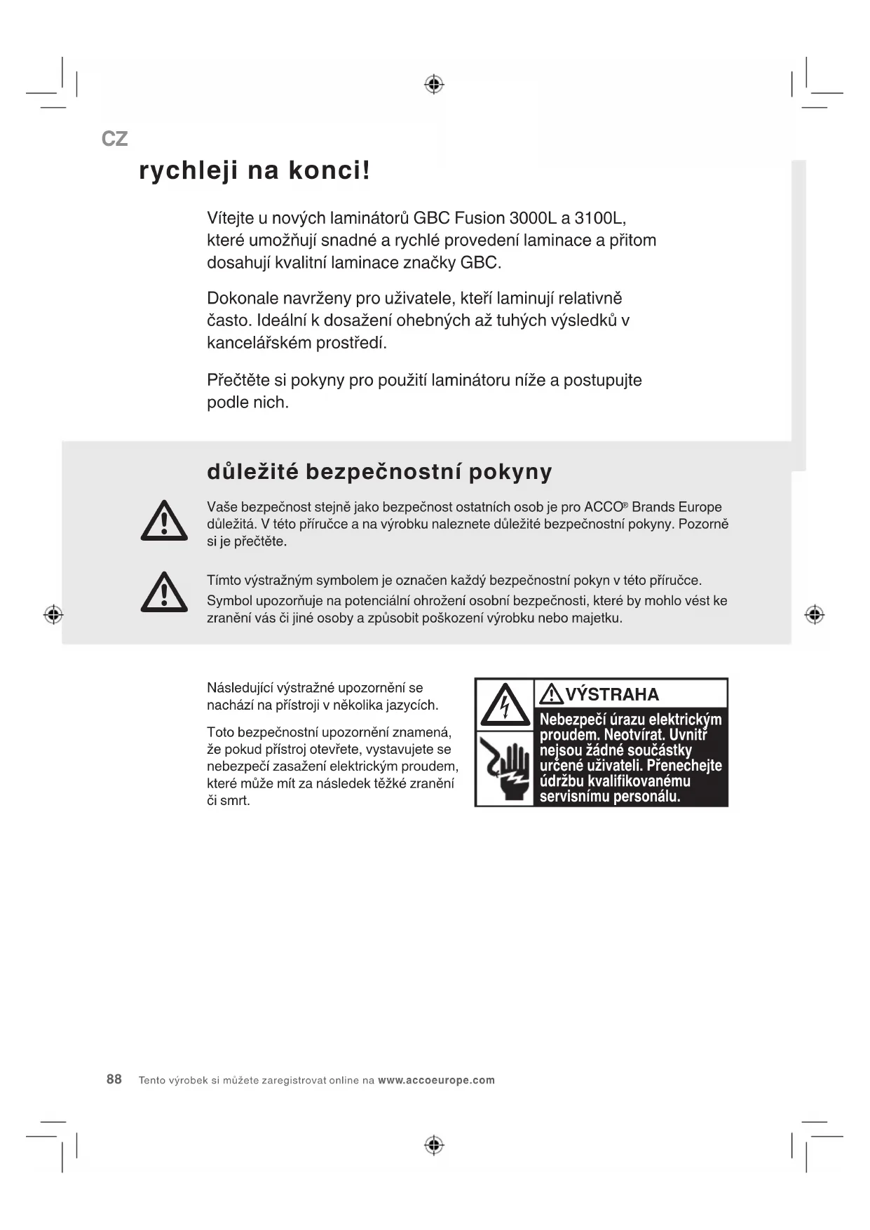 Následující výstražné upozornění se nachází na přístroji v několika jazycích. Toto bezpečnostní upozornění znamená, že pokud přístroj otevřete, vystavujete se nebezpečí zasažení elektrickým proudem, které může mít za následek těžké zranění či smrt. důležité bezpečnostní pokyny Vaše bezpečnost stejně jako bezpečnost ostatních osob je pro ACCO Brands Europe důležitá. V této příručce a na výrobku naleznete důležité bezpečnostní pokyny. Pozorně si je přečtěte. Tímto výstražným symbolem je označen každý bezpečnostní pokyn v této příručce.Symbol upozorňuje na potenciální ohrožení osobní bezpečnosti, které by mohlo vést ke zranění vás či jiné osoby a způsobit poškození výrobku nebo majetku.