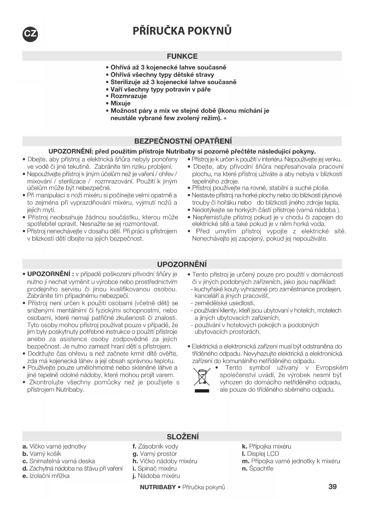 j. Nádoba mixéru k. Přípojka mixéru l. Displej LCD m. Přípojka varné jednotky k mixéru n. Špachtle PŘÍRUČKA POKYNŮA. OHŘEV KOJENECKÉ LAHVE A1. Připojte jednotku varu k jednotce mixování. A2. Odstraňte záchytnou nádobu na šťávu. A3. Naplňte nádržku 60 ml vody podle označení na nádobce mixéru (hladina C). A4. Odstraňte dna košíků pro vaření v páře. A5. Dna naskládejte na sebe a vložte je do přístroje. A6. Umístěte láhve na izolační mřížku nad nádržkou vody. A7. Varnou jednotku zakryjte víčkem. A8. Stiskněte tlačítko On/Off umístěné v zadní části mixovací jednotky. Displej LCD v přední části přístroje se rozsvítí. A9. Stiskněte tlačítko « mode » . Jednotlivé funkce se začnou zobrazovat na displeji. - Pokud je voda, kterou chcete ohřát, právě vyjmutá z chladničky, zastavte se na obrázku láhev + chladnička . - Pokud má voda, kterou chcete ohřát, pokojovou teplotu, zastavte se na obrázku láhev+dům . A10. Zvolte množství vody, kterou chcete ohřát, procházením programovaných množství za pomocí tlačítek + a -. A11. Stiskněte tlačítko OK pro potvrzení zvoleného množství vody. A12. Na konci cyklu se ozve zvukový signál, který vás upozorní na to, že je láhev ohřátá. Stisknutím tlačítka OK vypnete zvukový signál. B. OHŘEV DĚTSKÉ STRAVY VE SKLENIČCE Postupujte podle etap 1 až 5 funkce ohřevu lahvičky. B6. Umístěte skleničku s pokrmem na izolační mřížku. B7. Varnou jednotku zakryjte víčkem. B8. Stiskněte tlačítko On/Off umístěné v zadní části mixovací jednotky. Displej LCD v přední části přístroje se rozsvítí. B9. Stiskněte tlačítko « mode ». Jednotlivé funkce se začnou zobrazovat na displeji - Pokud je sklenička s dětskou stravou vyjmutá z chladničky, zastavte se na obrázku sklenička + chladnička . - Pokud má sklenička s dětskou stravou pokojovou teplotu, zastavte se na obrázku sklenička+dům . B10. Stisknutím tlačítka OK zahájíte cyklus ohřevu. UPOZORNĚNÍ : než přistoupíte ke krmení dítěte ,vždy ověřte teplotu pokrmu. Zamezíte tím možným rizikům spálení. Při přípravě kojenecké láhve dobře protřeste obsah, aby se rozpustilo sušené mléko. Teplotu ověřte kápnutím obsahu na vnitřek vašeho zápěstí. UPOZORNĚNÍ : programované cykly jsou vypočítány podle průměrné doby nutné k ohřátí láhve nebo dětské stravy ve skleničce. Materiál a tloušťka láhve ; snímatelné dno nebo velikost skleničky mohou ovlivnit teplotu láhve stejně jako ohřívání několika láhví současně. Pokud se vám bude zdát obsah příliš nebo málo teplý, můžete snížit či zvýšit dobu ohřevu použitím funkce « vaření v páře ». Význam označení jednotlivých funkcí NUTRIBABY • Návod k použití