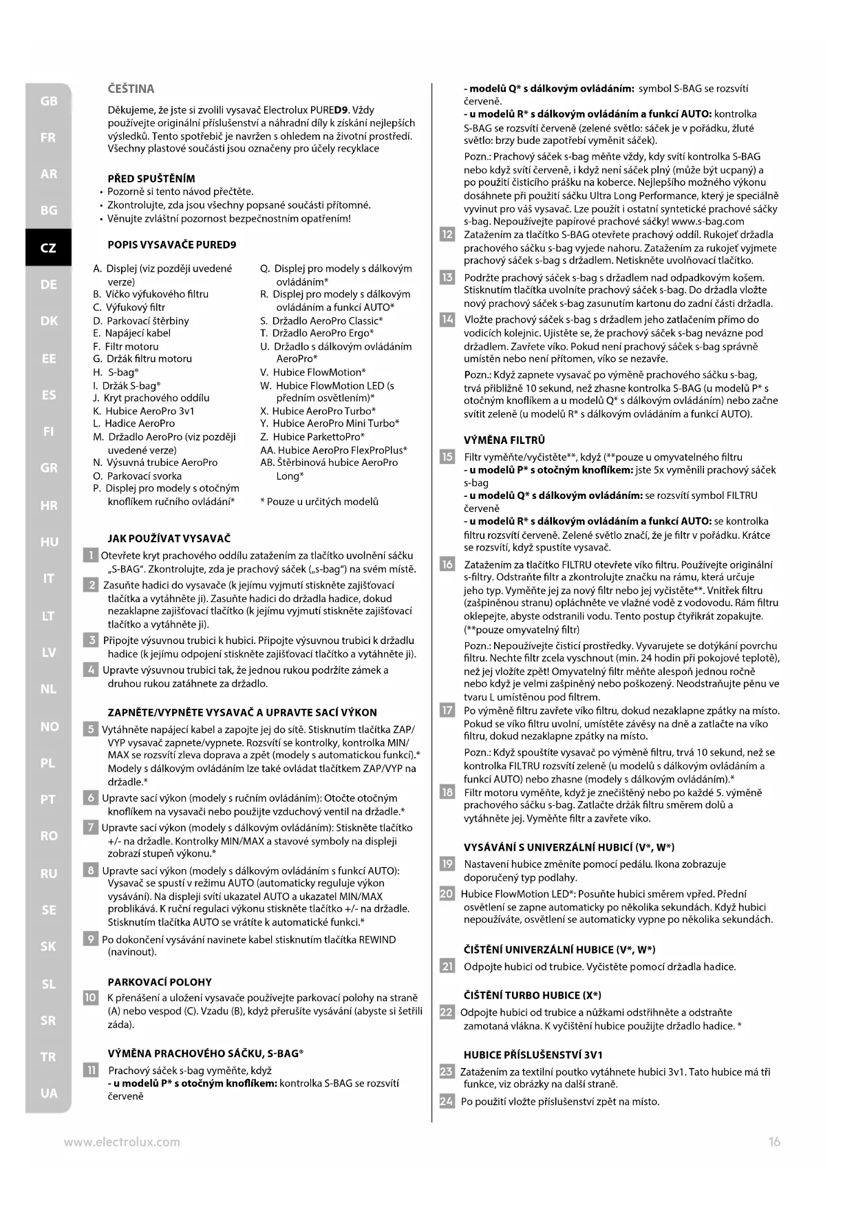 15 Filtr vyměňte/vyčistěte**, když (**pouze u omyvatelného ltru - u modelů P* s otočným knoíkem: jste 5x vyměnili prachový sáček s-bag - u modelů Q* s dálkovým ovládáním: se rozsvítí symbol FILTRU červeně - u modelů R* s dálkovým ovládáním a funkcí AUTO: se kontrolka ltru rozsvítí červeně. Zelené světlo značí, že je ltr v pořádku. Krátce se rozsvítí, když spustíte vysavač. 16 Zatažením za tlačítko FILTRU otevřete víko ltru. Používejte originální s-ltry. Odstraňte ltr a zkontrolujte značku na rámu, která určuje jeho typ. Vyměňte jej za nový ltr nebo jej vyčistěte**. Vnitřek ltru (zašpiněnou stranu) opláchněte ve vlažné vodě z vodovodu. Rám ltru oklepejte, abyste odstranili vodu. Tento postup čtyřikrát zopakujte. (**pouze omyvatelný ltr) Pozn.: Nepoužívejte čisticí prostředky. Vyvarujete se dotýkání povrchu ltru. Nechte ltr zcela vyschnout (min. 24 hodin při pokojové teplotě), než jej vložíte zpět! Omyvatelný ltr měňte alespoň jednou ročně nebo když je velmi zašpiněný nebo poškozený. Neodstraňujte pěnu ve tvaru L umístěnou pod ltrem. 17 Po výměně ltru zavřete víko ltru, dokud nezaklapne zpátky na místo. Pokud se víko ltru uvolní, umístěte závěsy na dně a zatlačte na víko ltru, dokud nezaklapne zpátky na místo. Pozn.: Když spouštíte vysavač po výměně ltru, trvá 10 sekund, než se kontrolka FILTRU rozsvítí zeleně (u modelů s dálkovým ovládáním a funkcí AUTO) nebo zhasne (modely s dálkovým ovládáním).* 18 Filtr motoru vyměňte, když je znečištěný nebo po každé 5. výměně prachového sáčku s-bag. Zatlačte držák ltru směrem dolů a vytáhněte jej. Vyměňte ltr a zavřete víko. VYSÁVÁNÍ S UNIVERZÁLNÍ HUBICÍ V*, W* 19 Nastavení hubice změníte pomocí pedálu. Ikona zobrazuje doporučený typ podlahy. 20 Hubice FlowMotion LED*: Posuňte hubici směrem vpřed. Přední osvětlení se zapne automaticky po několika sekundách. Když hubici nepoužíváte, osvětlení se automaticky vypne po několika sekundách. ČIŠTĚNÍ UNIVERZÁLNÍ HUBICE V*, W* 21 Odpojte hubici od trubice. Vyčistěte pomocí držadla hadice.