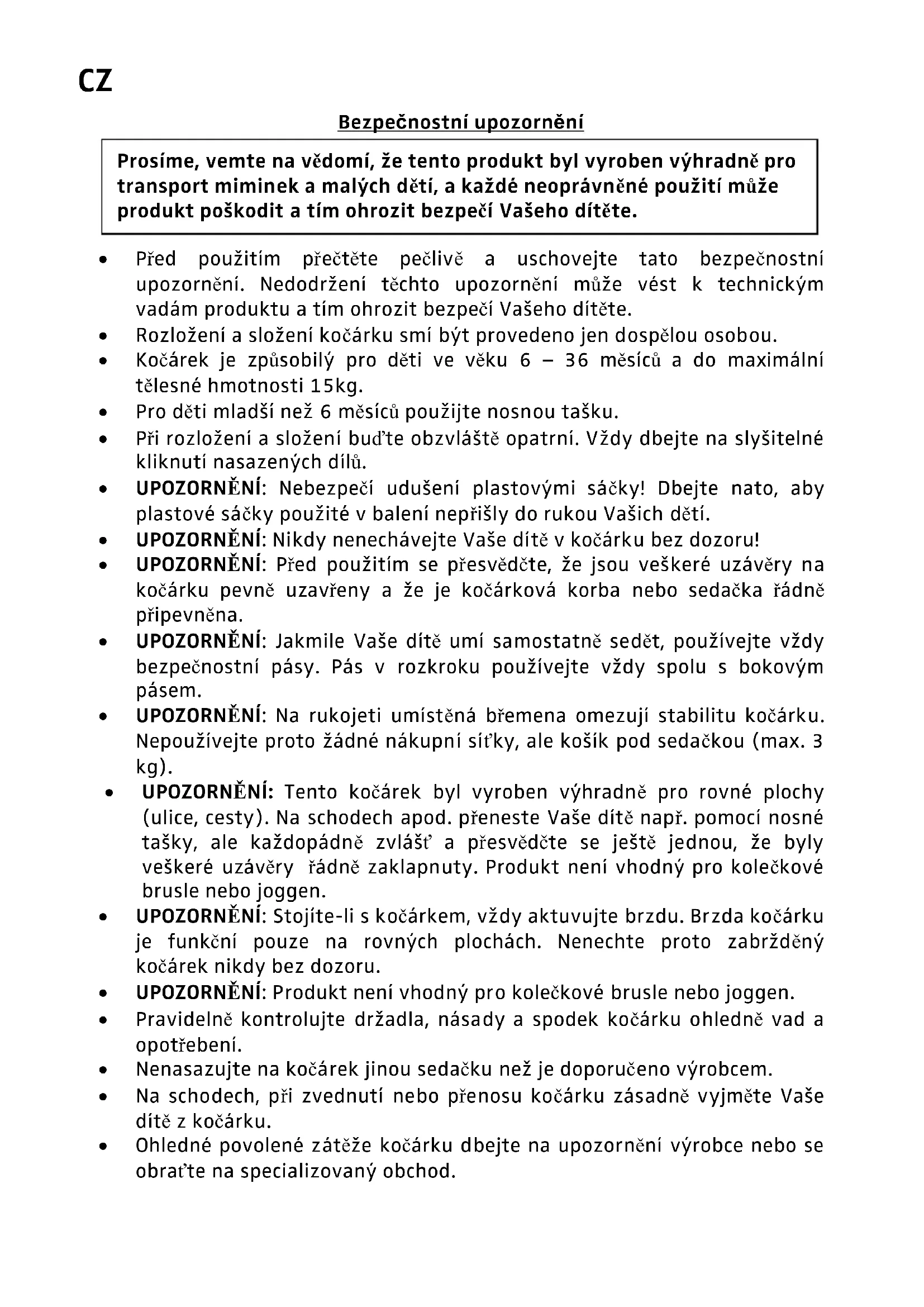 Před použitím přečtěte pečlivě a uschovejte tato bezpečnostní upozornění. Nedodržení těchto upozornění může vést k technickým vadám produktu a tím ohrozit bezpečí Vašeho dítěte. Rozložení a složení kočárku smí být provedeno jen dospělou osobou. Kočárek je způsobilý pro děti ve věku 6 – 36 měsíců a do maximální tělesné hmotnosti 15kg. Pro děti mladší než 6 měsíců použijte nosnou tašku. Při rozložení a složení buďte obzvláště opatrní. Vždy dbejte na slyšitelné kliknutí nasazených dílů. UPOZORNĚNÍ: Nebezpečí udušení plastovými sáčky! Dbejte nato, aby plastové sáčky použité v balení nepřišly do rukou Vašich dětí. UPOZORNĚNÍ: Nikdy nenechávejte Vaše dítě v kočárku bez dozoru! UPOZORNĚNÍ: Před použitím se přesvědčte, že jsou veškeré uzávěry na kočárku pevně uzavřeny a že je kočárková korba nebo sedačka řádně připevněna. UPOZORNĚNÍ: Jakmile Vaše dítě umí samostatně sedět, používejte vždy bezpečnostní pásy. Pás v rozkroku používejte vždy spolu s bokovým pásem. UPOZORNĚNÍ: Na rukojeti umístěná břemena omezují stabilitu kočárku. Nepoužívejte proto žádné nákupní síťky, ale košík pod sedačkou (max. 3 kg). UPOZORNĚNÍ: Tento kočárek byl vyroben výhradně pro rovné plochy (ulice, cesty). Na schodech apod. přeneste Vaše dítě např. pomocí nosné tašky, ale každopádně zvlášť a přesvědčte se ještě jednou, že byly veškeré uzávěry řádně zaklapnuty. Produkt není vhodný pro kolečkové brusle nebo joggen. UPOZORNĚNÍ: Stojíte-li s kočárkem, vždy aktuvujte brzdu. Brzda kočárku je funkční pouze na rovných plochách. Nenechte proto zabržděný kočárek nikdy bez dozoru. UPOZORNĚNÍ: Produkt není vhodný pro kolečkové brusle nebo joggen. Pravidelně kontrolujte držadla, násady a spodek kočárku ohledně vad a opotřebení. Nenasazujte na kočárek jinou sedačku než je doporučeno výrobcem. Na schodech, při zvednutí nebo přenosu kočárku zásadně vyjměte Vaše dítě z kočárku. Ohledné povolené zátěže kočárku dbejte na upozornění výrobce nebo se obraťte na specializovaný obchod. Prosíme, vemte na vědomí, že tento produkt byl vyroben výhradně pro transport miminek a malých dětí, a každé neoprávněné použití může produkt poškodit a tím ohrozit bezpečí Vašeho dítěte.