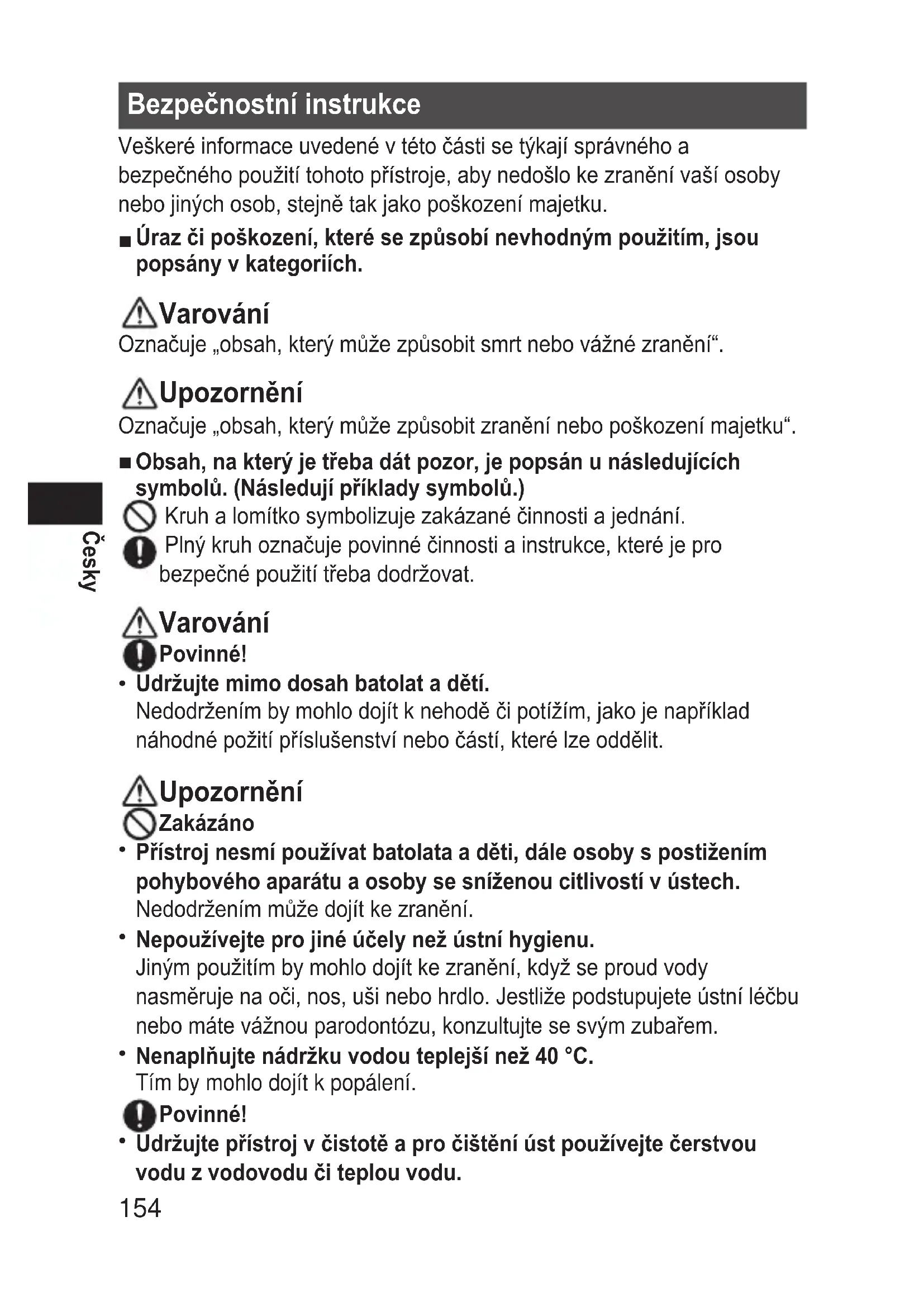 Dávejte pozor na ty, kteří nemohou manipulovat s přístrojem sami, jako jsou děti a batolata nebo osoby s vysokou citlivostí v ústech.