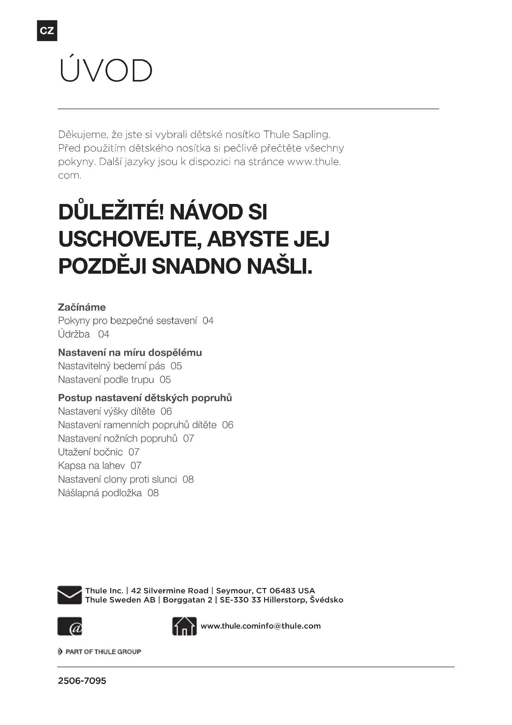 A. Træk flippen på polstringen ned for at stabilisere barnebærestolen, nårdutager dit barn ud. A506-7095 Thule Sapling Návod EN Instructions FR Instructions DE Anleitung NL Instructies NO Instruksjoner DA Instruktioner CZ Návod PL Instrukcje FI Ohjeet IT Istruzioni ES Instrucciones PT Instruções RU Инструкции SV Instruktioner JA 取扱説明書 ZH 说明 TW 說明 ET Juhised HR UputeCZ 2 506-7095 Thule Inc. | 42 Silvermine Road | Seymour, CT 06483 USA Thule Sweden AB | Borggatan 2 | SE-330 33 Hillerstorp, Švédsko www.thule.cominfo@thule.com Děkujeme, že jste si vybrali dětské nosítko Thule Sapling. Před použitím dětského nosítka si pečlivě přečtěte všechny pokyny. Další jazyky jsou kdispozici na stránce www.thule. com.