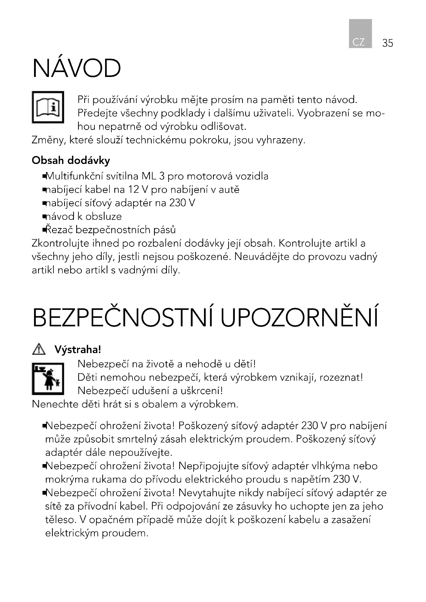 - Nebezpeci ohrozeniŽivota! Poškozený sǐtový adaptér 230 V pro nabijeni můze způsobit smrtny zásah elektrickým proudem. Poškozený sǐtový adaptér dále nepoužívejte.