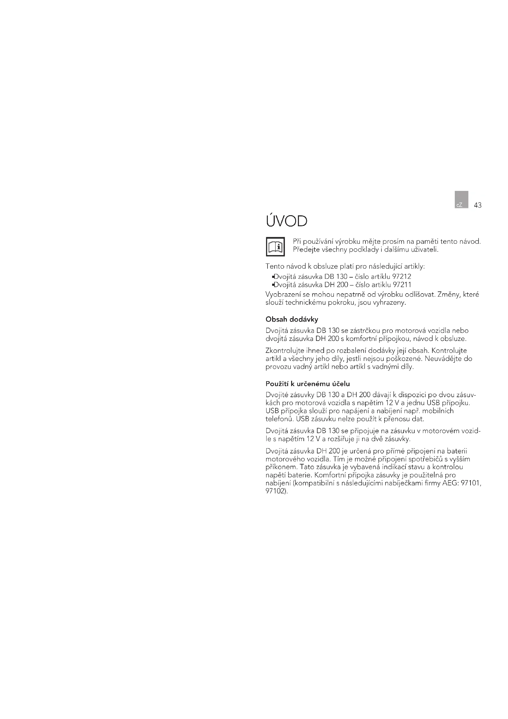 Dvojitá zásuvka DH 200 – číslo artiklu 97211 Vyobrazení se mohou nepatrně od výrobku odlišovat. Změny, které slouží technickému pokroku, jsou vyhrazeny. Obsah dodávky Dvojitá zásuvka DB 130 se zástrčkou pro motorová vozidla nebo dvojitá zásuvka DH 200 s komfortní přípojkou, návod k obsluze. Zkontrolujte ihned po rozbalení dodávky její obsah. Kontrolujte artikl a všechny jeho díly, jestli nejsou poškozené. Neuvádějte do provozu vadný artikl nebo artikl s vadnými díly. Použití k určenému účelu Dvojité zásuvky DB 130 a DH 200 dávají k dispozici po dvou zásuv- kách pro motorová vozidla s napětím 12 V a jednu USB přípojku. USB přípojka slouží pro napájení a nabíjení např. mobilních telefonů. USB zásuvku nelze použít k přenosu dat. Dvojitá zásuvka DB 130 se připojuje na zásuvku v motorovém vozid- le s napětím 12 V a rozšiřuje ji na dvě zásuvky. Dvojitá zásuvka DH 200 je určená pro přímé připojení na baterii motorového vozidla. Tím je možné připojení spotřebičů s vyšším příkonem. Tato zásuvka je vybavená indikací stavu a kontrolou napětí baterie. Komfortní přípojka zásuvky je použitelná pro nabíjení (kompatibilní s následujícími nabíječkami rmy AEG: 97101, 97102).4544 Každé jiné použití nebo pozměnění dvojité zásuvky platí jako použití k jinému než určenému účelu a může způsobit různá nebezpečí. Dvojitá zásuvka je určená jen k privátnímu použití. Dbejte na maximálně přípustný příkon připojených spotřebičů (viz. „Technické údaje“).