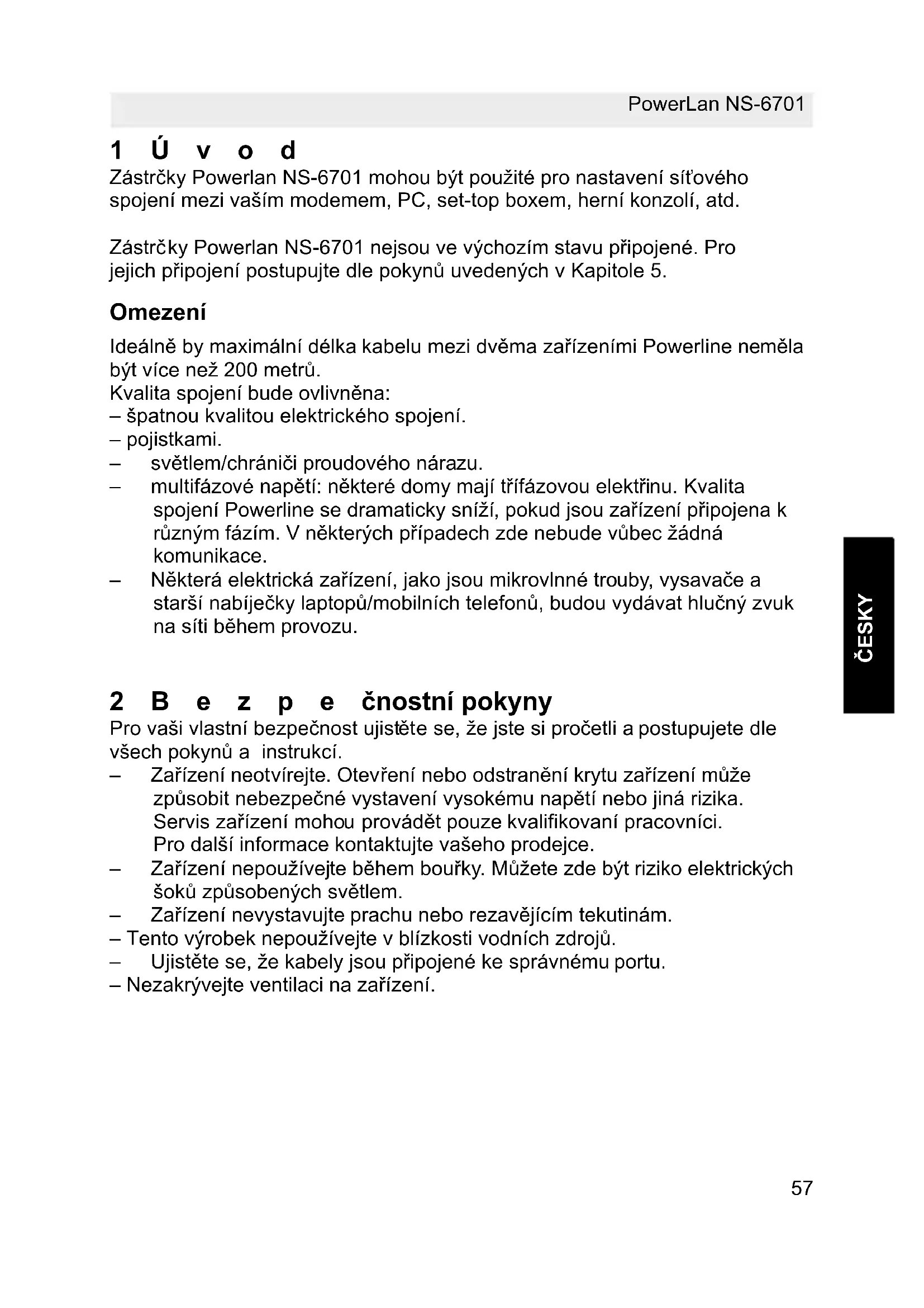 ČESKY 1Úvod Zástrčky Powerlan NS-6701 mohou být použité pro nastavení síťového spojení mezi vaším modemem, PC, set-top boxem, herní konzolí, atd. Zástrč ky Powerlan NS-6701 nejsou ve výchozím stavu připojené. Pro jejich připoje ní postupujte dle pokynů uvedených v Kapitole 5. Omezení Ideálně by maximální délka kabelu mezi dvěma zařízeními Powerline neměla být více než 200 metrů. Kvalita spojení bude ovlivněna: – špatnou kvalitou elektrického spojení. – pojistkami. –světlem/chrániči proudového nárazu. – multifázové napětí: některé domy mají třífázovou elektřinu. Kvalita spojení Powerline se dramaticky sníží, pokud jsou zařízení připojena k různým fázím. V některých případech zde nebude vůbec žádná komunikace. –Některá elektrická zařízení, jako jsou mikrovlnné trouby, vysavače a starší nabíječky laptopů/mobilních telefonů, budou vydávat hlučný zvuk na síti během provozu. 2Bezpečnostní pokyny Pro vaši vlastní bezpečnost ujistěte se, že jste si pročetli a postupujete dle všech pokynů a instrukcí. –Zařízení neotvírejte. Otevření nebo odstranění krytu zařízení může způsobit nebezpečné vystavení vysokému napětí nebo jiná rizika. Servis zařízení mohou provádět pouze kvalifikovaní pracovníci. Pro další informace kontaktujte vašeho prodejce. –Zařízení nepoužívejte během bouřky. Můžete zde být riziko elektrických šoků způsobených světlem. –Zařízení nevystavujte prachu nebo rezavějícím tekutinám. – Tento výrobek nepoužívejte v blízkosti vodních zdrojů. –Ujistěte se, že kabely jsou připojené ke správnému portu. – Nezakrývejte ventilaci na zařízení.PowerLan NS-6701