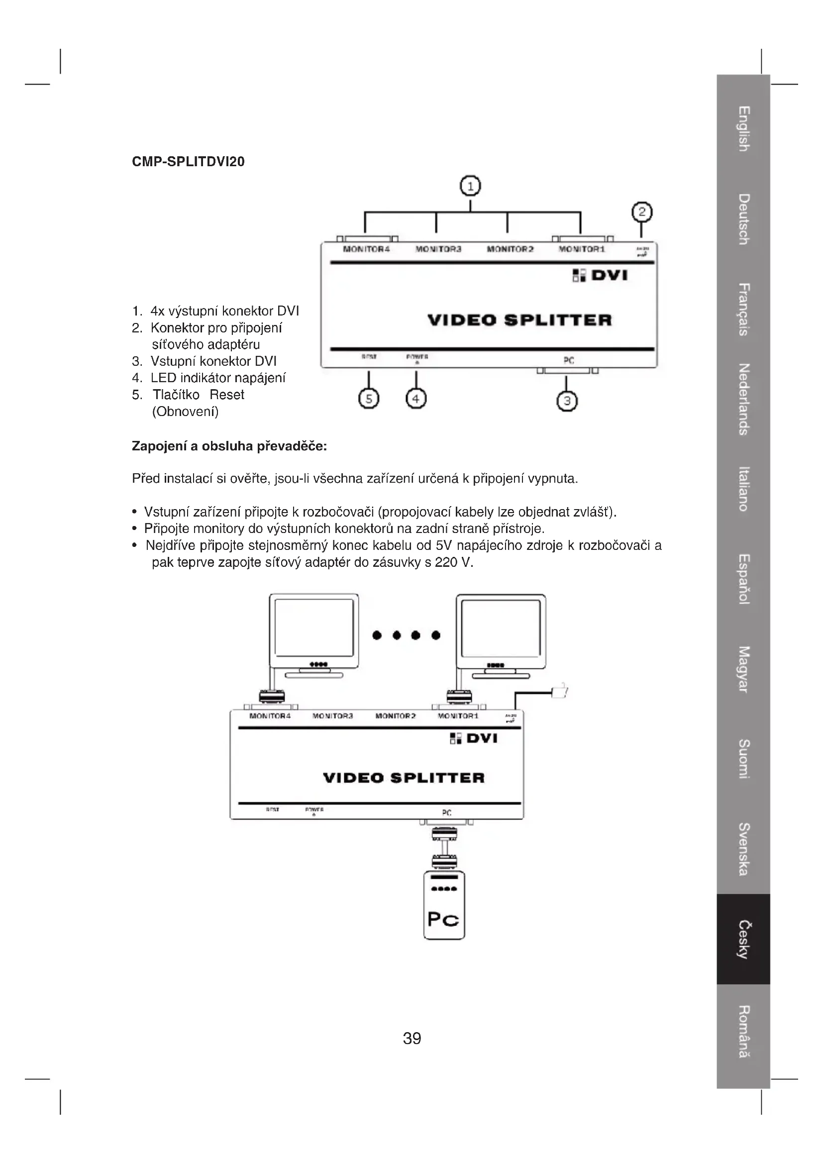 - Nejdříve připojte stejnosměrný konec kabelu od 5V napájecího zdroje k rozbočovači a pak teprve zapojte síťový adaptér do zásuvky s 220 V.40 Prohlášení o shodě Společnost Nedis B.V. De Tweeling 28 5215MC ’s-Hertogenbosch Nizozemí Tel.: 0031 73 599 1055 E-mail: info@nedis.com prohlašuje, že výrobek: Značka: CMP-SPLITDVI10 a CMP-SPLITDVI20 Model: 2 a 4násobný rozbočovač DVI Popis: 2 a 4násobné rozbočovače DVI fi rmy KÖNIG splňuje následující normy: Elektromagnetická kompatibilita: EN 55022(1998+A1:2000+A2:2003) EN61000-3-2(2006) EN61000-3-3(1995+A1:2001+A2:2005) EN55024(1998+A1:2001+A2:2003) EN61000-4-2(1995+A1:1998+A2:2001) /-3(2002+A1:2002)/ -4(2004)/-5(1995+A1:2001)/-6(1996+A1:2001)/-11(2004) Elektronická zařízení napájená ze sítě: IEC 60950-1:2001 a odpovídá ustanovením směrnice 2004/108/EEC. ‘s-Hertogenbosch, 01 červenec 2008 Mrs. J. Gilad Obchodní ředitel41 Bezpečnostní opatření: UPOZORNĚNÍ NEBEZPEČÍ ÚRAZU