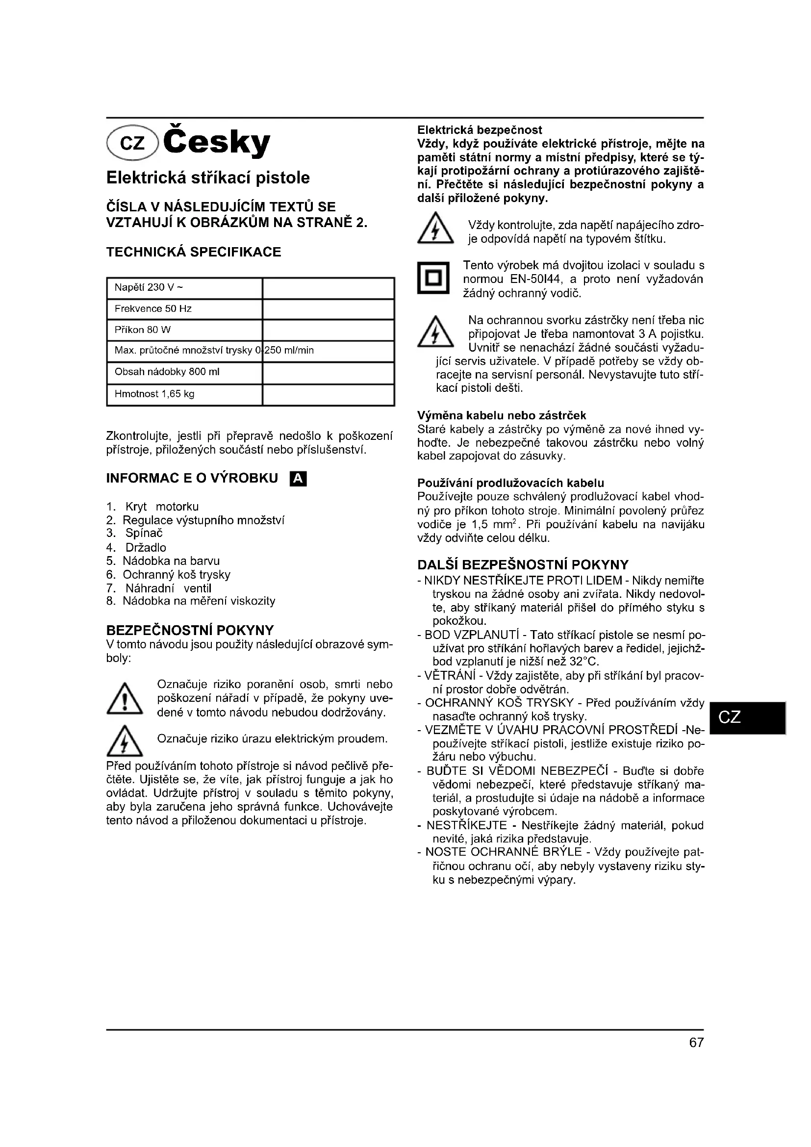 Elektrická stříkací pistole ČÍSLA V NÁSLEDUJÍCÍM TEXTŮ SE VZTAHUJÍ K OBRÁZKŮM NA STRANĚ 2. TECHNICKÁ SPECIFIKACE Napětí 230 V ~Frekvence 50 HzPříkon 80 WMax. průtočné množství trysky 0-250 ml/minObsah nádobky 800 mlHmotnost 1,65 kg Zkontrolujte, jestli při přepravě nedošlo k poškození přístroje, přiložených součástí nebo příslušenství.