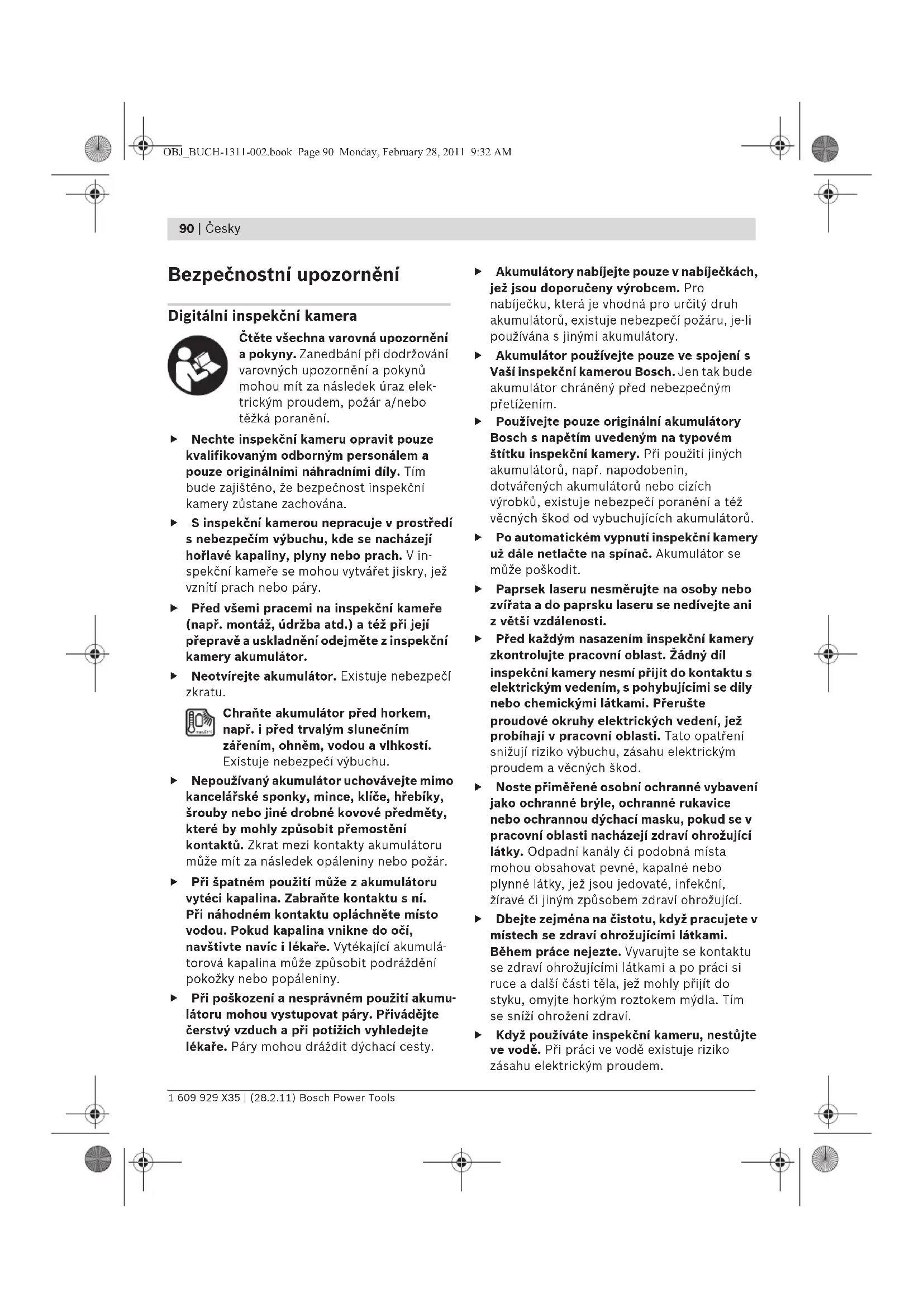 Nejmenší poloměr ohybu kabelu kamery mm 120 Průměr hlavy kamery mm 17/9,5 Rozsah hloubky ostrosti čočky kamery mm 38–∞ Úhlopříčka displeje mm 68,6 Rozlišení displeje 320 x 240 Formát video výstupu NTSC Provozní doba ca. h15 Hmotnost podle EPTA- Procedure 01/2003 kg 0,68 Rozměry (délka x šířka x výška) mm 166 x 66 x 45 1) bez oroseníDbejte prosím objednacího čísla na typovém štítku inspekční kamery. Obchodní označení jednotlivých inspekčních kamer se mohou měnit. OBJ_BUCH-1311-002.book Page 91 Monday, February 28, 2011 9:32 AM92 | Česky 1 609 929 X35 | (28.2.11) Bosch Power Tools Montáž f Před všemi pracemi na inspekční kameře (např. montáž, údržba atd.) a též při její přepravě a uskladnění odejměte z inspekční kamery akumulátor. Nabíjení akumulátoru f Používejte pouze nabíječky uvedené na grafické straně. Pouze tyto nabíječky jsou sladěné s akumulátorem Li-ion použitým u Vaší inspekční kamery. Upozornění: Akumulátor se expeduje částečně nabitý. Pro zaručení plného výkonu akumulátoru jej před prvním nasazením v nabíječce zcela nabijte. Akumulátor Li-ion lze bez zkrácení životnosti kdykoli nabít. Přerušení procesu nabíjení nepoškozuje akumulátor. Akumulátor je vybaven kontrolou teploty NTC, která dovolí nabíjení pouze v rozmezí teplot 0 °C a 45 °C. Tím se dosáhne vysoké životnosti akumulátoru. Ukazatel stavu nabití akumulátoru U zapnuté inspekční kamery se na displeji 5 zobrazuje ukazatel stavu nabití akumulátoru: Odejmutí akumulátoru Pro odejmutí akumulátoru 10 stlačte odjišťovací tlačítka 11 a akumulátor vytáhněte směrem dozadu z inspekční kamery. Nepoužívejte přitom žádné násilí. Montáž kabelu kamery (viz obr. A) Pro provoz inspekční kamery se musí namontovat kabel kamery 6 na ruční přístroj 1. Nastrčte kabel kamery 6 na přípojku kamery 14 tak, aby kolík kabelu kamery zasahoval do vybrání na přípojce kamery jak je vyobrazeno na obrázku. Nasuňte pouzdro 13 na přípojce kamery přes kabel kamery a rukou je ve směru hodinových ručiček přišroubujte. Pro odejmutí kabelu kamery 6 odšroubujte pouzdro 13 proti směru hodinových ručiček a kabel kamery stáhněte. Montáž prodloužení kabelu kamery (příslušenství) Pro montáž prodloužení kabelu kamery 12 musíte odejmout stávající kabel kamery 6. Potom nasaďte prodloužení 12 jako je popsáno u „Montáž kabelu kamery“ na přípojku kamery 14 a pevně jej přišroubujte. Podle potřeby můžete stejným způsobem namontovat další prodloužení. Od zhruba 10 m celkové délky (včetně kabelu kamery) se však zhoršuje kvalita obrazu. Našroubujte kabel kamery 6 na poslední prodloužení 12 jako je popsáno u „Montáž kabelu kamery“. f Zkontrolujte, zda jsou kabel kamery a prodloužení pevně spojeny. Jen při pevném spojení jsou kabel kamery a prodloužení vodotěsné. Netěsnící spoje zvyšují riziko zásahu elektrickým proudem nebo riziko poškození inspekční kamery. Montáž zrcátka, magnetu nebo závěsu (viz obr. B) Zrcátko 17, magnet 15 a závěs 16 lze jako pomůcky namontovat na hlavu kamery 7. Nasuňte jednu ze tří pomůcek jak je vyobrazeno na obrázku až na doraz na vybrání na hlavě kamery 7. Upozornění: Magnet 15 a závěs 16 jsou vhodné pouze pro pohybování a odstraňování volně ležících, drobných a lehkých předmětů. Při příliš silném tahu se může inspekční kamera nebo pomůcka poškodit. Ukazatel Kapacita >1/2 <1/2 rezerva OBJ_BUCH-1311-002.book Page 92 Monday, February 28, 2011 9:32 AMČesky | 93 Bosch Power Tools 1 609 929 X35 | (28.2.11) Připojení externího monitoru (viz obr. C) Obrazový signál inspekční kamery můžete přenášet na externí monitor, jež umí zobrazovat standardní NTSC video signál. Zastrčte černou zástrčku dodaného video kabelu 19 do zdířky video výstupu 18 na inspekční kameře. Video kabel připojte na vhodný monitor. Čtěte a respektujte návod k provozu externího monitoru. Provoz f Chraňte ruční přístroj 1 a akumulátor 10 před vlhkem a přímým slunečním zářením. Kabel kamery, hlava kamery a prodloužení jsou při správné montáži vodotěsné do hloubky 10 m. Ruční přístroj a akumulátor však nejsou proti vodě chráněné, při styku s vodou existuje riziko zásahu elektrickým proudem nebo riziko poškození. f Nevystavujte inspekční kameru žádným extrémním teplotám nebo teplotním výkyvům. Nenechávejte ji např. delší dobu ležet v autě. Inspekční kameru nechte při větších teplotních výkyvech nejprve vytemperovat, než ji uvedete do provozu. f Inspekční kameru nepoužívejte, pokud je čočka na hlavě kamery 7 orosená. Inspekční kameru zapněte teprve, když se vlhkost odpařila. Inspekční kamera se jinak může poškodit. Uvedení do provozu Nasazení akumulátoru f Používejte pouze originální akumulátory Li-ion firmy Bosch s napětím uvedeným na typovém štítku Vaší inspekční kamery. Používání jiných akumulátorů může vést ke zraněním a nebezpečí požáru. Upozornění: Používání akumulátorů nevhodných pro Vaši inspekční kameru může vést k chybným funkcím nebo k poškození inspekční kamery. Nasaďte nabitý akumulátor 10 do držadla až zna- telně zaskočí a přesvědčivě přiléhá k držadlu. Zapnutí – vypnutí Pro zapnutí inspekční kamery stiskněte tlačítko zapnutí-vypnutí 3. Na displeji 5 se zobrazí hlavou kamery 7 zachycený obraz. Pro vypnutí inspekční kamery stiskněte znovu tlačítko zapnutí-vypnutí 3. Nestlačí-li se ca. 20 min na inspekční kameře žádné tlačítko, pak se kvůli šetření akumulátoru automaticky vypne. Regulace osvětlení v hlavě kamery Pro zjasnění obrazu kamery na displeji 5 můžete zapnout osvětlení 9 v hlavě kamery a regulovat intenzitu. Pro zapnutí osvět