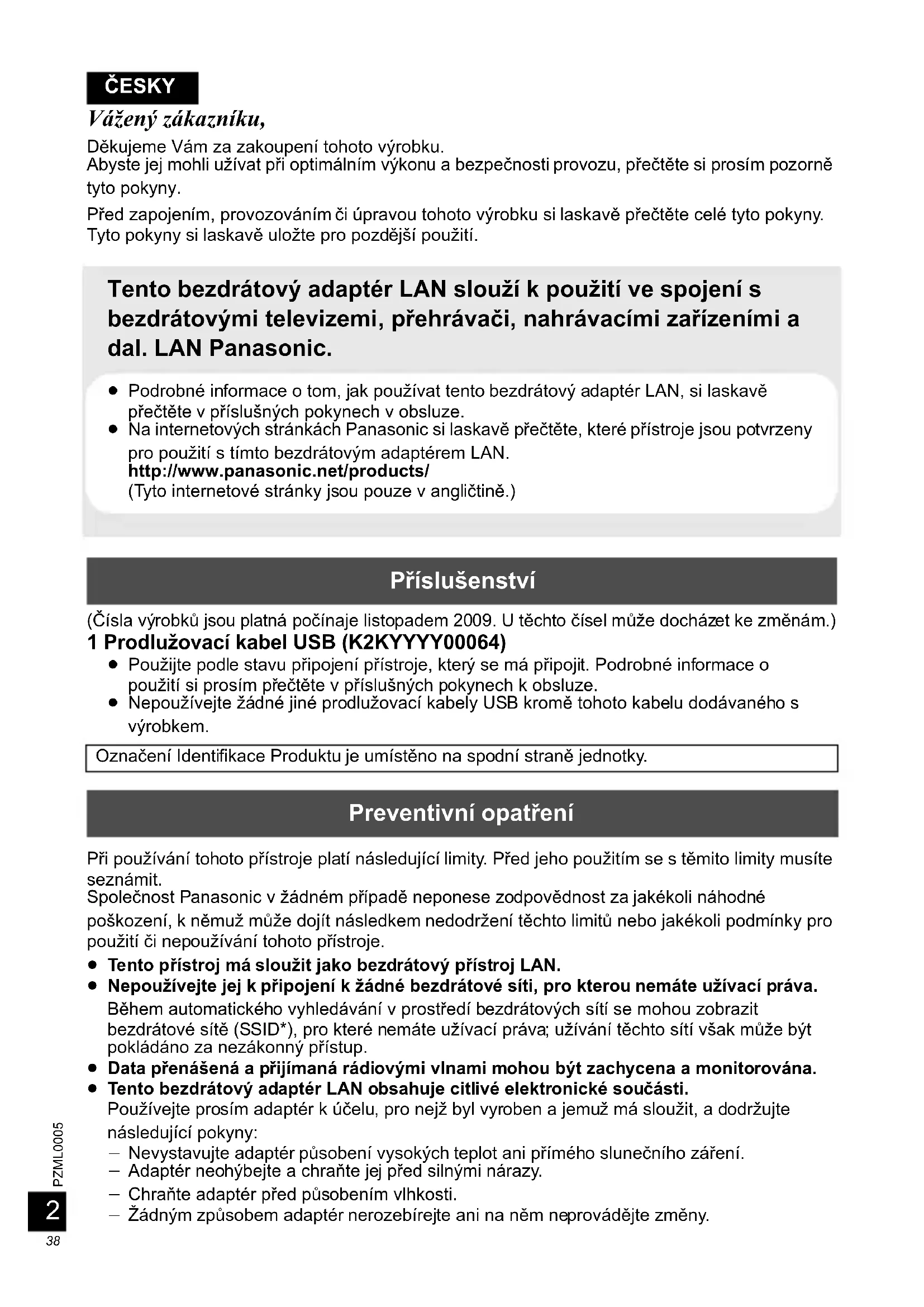 DY-WL10_E.book 37 ページ 2009年12月8日 火曜日 午後3時43分38 PZML0005 Vážený zákazníku, Děkujeme Vám za zakoupení tohoto výrobku. Abyste jej mohli užívat při optimálním výkonu a bezpečnosti provozu, přečtěte si prosím pozorně tyto pokyny. Před zapojením, provozováním či úpravou tohoto výrobku si laskavě přečtěte celé tyto pokyny. Tyto pokyny si laskavě uložte pro pozdější použití. Tento bezdrátový adaptér LAN slouží k použití ve spojení s bezdrátovými televizemi, přehrávači, nahrávacími zařízeními a dal. LAN Panasonic. (Čísla výrobků jsou platná počínaje listopadem 2009. U těchto čísel může docházet ke změnám.) 1 Prodlužovací kabel USB (K2KYYYY00064) ≥ Použijte podle stavu připojení přístroje, který se má připojit. Podrobné informace o použití si prosím přečtěte v příslušných pokynech k obsluze. ≥ Nepoužívejte žádné jiné prodlužovací kabely USB kromě tohoto kabelu dodávaného s výrobkem. Při používání tohoto přístroje platí následující limity. Před jeho použitím se s těmito limity musíte seznámit. Společnost Panasonic v žádném případě neponese zodpovědnost za jakékoli náhodné poškození, k němuž může dojít následkem nedodržení těchto limitů nebo jakékoli podmínky pro použití či nepoužívání tohoto přístroje. ≥ Tento přístroj má sloužit jako bezdrátový přístroj LAN. ≥ Nepoužívejte jej k připojení k žádné bezdrátové síti, pro kterou nemáte užívací práva. Během automatického vyhledávání v prostředí bezdrátových sítí se mohou zobrazit bezdrátové sítě (SSID*), pro které nemáte užívací práva; užívání těchto sítí však může být pokládáno za nezákonný přístup. ≥ Data přenášená a přijímaná rádiovými vlnami mohou být zachycena a monitorována. ≥ Tento bezdrátový adaptér LAN obsahuje citlivé elektronické součásti. Používejte prosím adaptér k účelu, pro nejž byl vyroben a jemuž má sloužit, a dodržujte následující pokyny: j Nevystavujte adaptér působení vysokých teplot ani přímého slunečního záření. j Adaptér neohýbejte a chraňte jej před silnými nárazy. j Chraňte adaptér před působením vlhkosti. j Žádným způsobem adaptér nerozebírejte ani na něm neprovádějte změny. ≥ Podrobné informace o tom, jak používat tento bezdrátový adaptér LAN, si laskavě přečtěte v příslušných pokynech v obsluze. ≥ Na internetových stránkách Panasonic si laskavě přečtěte, které přístroje jsou potvrzeny pro použití s tímto bezdrátovým adaptérem LAN. http://www.panasonic.net/products/ (Tyto internetové stránky jsou pouze v angličtině.) Příslušenství Označení Identifikace Produktu je umístěno na spodní straně jednotky. Preventivní opatření ČESKY