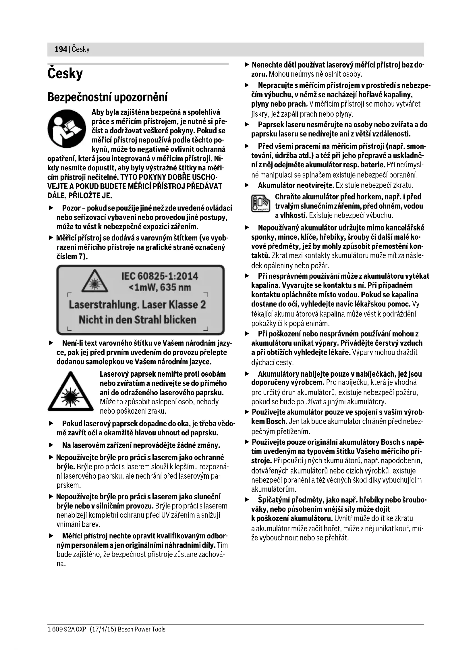 Ve všech rozsazích vně veličin zobrazených v technických datech může dojít k odchylkám výsledků měření.4) Vztahuje se na infračervené měření, viz grafika: 5) U přístrojů s Bluetooth®-Low-Energy nemusí být v závislosti na modelu a operačním systému možné navázání spojení. Přístroje s Bluetooth® musí podporovat SPP profil.6) Omezený výkon při teplotách <0 °CTechnická data zjištěna s akumulátorem z obsahu dodávky. K jednoznačné identifikaci Vašeho měřícího přístroje slouží sériové číslo 6 na typovém štítku. Ø 40 mm Ø 55 mm Ø 100 mm 1 m 2 m 5 m Henk Becker Executive Vice President Engineering Helmut Heinzelmann Head of Product Certification PT/ETM9 OBJ_BUCH-2270-002.book Page 197 Friday, April 17, 2015 9:48 AM198 | Česky 1 609 92A 0XP | (17/4/15) Bosch Power Tools Používejte pouze nabíječky uvedené v technických da- tech. Jen tyto nabíječky jsou přizpůsobené pro lithium- iontový akumulátor, který lze používat s vaším měřicím pří- strojem. Lithium-iontový akumulátor lze kdykoli nabít, aniž by se zkrá- tila jeho životnost. Přerušení procesu nabíjení akumulátoru neškodí. Po automatickém vypnutí měřicího přístroje již nestis- kávejte znovu tlačítko zapnutí/vypnutí. Akumulátor se může poškodit. Pro nasazení nabitého akumulátoru 30 ho zasuňte do akumu- látorové šachty 29 tak, aby citelně zaskočil a nevyčníval z držadla měřicího přístroje. Pro vyjmutí akumulátoru 30 stiskněte odjišťovací tlačítka 3 a vytáhněte akumulátor z akumulátorové šachty 29. Nepouží- vejte přitom násilí. Provoz s bateriemi (3 601 K83 370) (viz obr. C) Pro otevření přihrádky pro baterie 31 stiskněte odjišťovací tlačítka 3 a sejměte kryt přihrádky na baterie. Při vkládání baterií dbejte na správnou polaritu podle vyobra- zení na krytu přihrádky pro baterie. Nasaďte znovu kryt přihrádky pro baterie 31 a nechte ho ci- telně zaskočit. Nahraďte vždy všechny baterie současně. Použijte pouze ba- terie jednoho výrobce a stejné kapacity. Pokud měřící přístroj delší dobu nepoužíváte, vyjměte z něj baterie. Baterie mohou pří delším skladování koro- dovat a samy se vybít. Ukazatel stavu nabití Ukazatel stavu nabití g na displeji zobrazuje stav nabití baterií, resp. akumulátoru 30. Provoz Uvedení do provozu Chraňte měřicí přístroj před vlhkem, přímým sluneč- ním zářením, prachem a nečistotami. Nevystavujte měřící přístroj žádným extrémním teplo- tám nebo teplotním výkyvům. Nenechávejte jej např. delší dobu ležet v autě. Při větších teplotních výkyvech ne- chte měřící přístroj nejprve vytemperovat, než jej uvedete do provozu. Při extrémních teplotách nebo teplotních vý- kyvech může být omezena přesnost přístroje. Dbejte na správnou aklimatizaci měřicího přístroje. Při silném kolísání teplot může doba aklimatizace trvat až 15 min. Zabraňte prudkým nárazům nebo pádu měřicího pří- stroje. Po působení silných vnějších vlivů a při neobvyk- lém chování funkcí byste měli nechat měřicí přístroj zkont- rolovat v autorizovaném servisu Bosch. Měřicí přístroj je vybavený rádiovým rozhraním. Je nutné dodržovat místní omezení provozu, např. v letadlech nebo nemocnicích. Zapnutí – vypnutí Sejměte ochrannou krytku 21 z čočky infračerveného přijíma- če 23 a ochrannou krytku 19 ze senzoru vlhkosti vzduchu a teploty prostředí 5. Během práce dbejte na to, aby fotoa- parát 22, čočka přijímače 23 a senzor 5 nebyly zavřené, resp. zakryté, protože jinak nelze provádět správně měře- ní. Pro zapnutí měřicího přístroje stiskněte tlačítko zapnutí/vy- pnutí 12 nebo tlačítko měření 4. Na displeji 18 se zobrazí úvodní sekvence. Po úvodní sekvenci se měřicí přístroj nachá- zí v druhu provozu, který se uložil při posledním vypnutí. Lase- ry ještě nejsou zapnuté. Pouze při prvním uvedení do provozu se po úvodní sekvenci zobrazí ještě menu „Přístroj“, ve kterém můžete provést na- stavení měřicího přístroje, jako např. jazyka všech zobrazení (ovládání viz „Podmenu „Přístroj““, strana 203). Zvolená na- stavení potvrďte stisknutím levého funkčního tlačítka 17. Všechna nastavení lze změnit také později v podmenu „Pří- stroj“. Neponechávejte zapnutý měřící přístroj bez dozoru a po používání jej vypněte. Mohly by být laserovým pa- prskem oslněny jiné osoby. Nesměrujte laserový paprsek na osoby nebo zvířata a nedívejte se sami do něj a to ani z větší vzdálenosti. Z důvodu úspory energie se při nastavení z výroby 30 s po každém stisknutí tlačítka sníží jas osvětlení displeje. Při stisk- nutí libovolného tlačítka se osvětlení displeje znovu zapne v plné intenzitě. V menu „Doba osvětl.“ můžete tuto dobu osvětlení změnit (viz „Doba osvětlení“, strana 203). Pro vypnutí měřicího přístroje stiskněte tlačítko zapnutí/vy- pnutí. Měřicí přístroj uloží aktuální druh provozu a nastavení a poté se vypne. Nasaďte ochrannou krytku 21 zpět na čočku přijímače 23 a ochrannou krytku 19 na senzor vlhkosti vzdu- chu a teploty prostředí 5. Měřicí přístroj nevypínejte vyjmutím akumulátoru, resp. adaptéru pro baterie, protože by se přitom mohla v určitých případech poškodit interní paměť. Vmenu „Vypínací čas“ můžete nastavit, zda a po jakém časo- vém intervalu bez stisknutí tlačítka/měření se měřicí přístroj automaticky vypne (viz „Vypínací čas“, strana 203). Také při automatickém vypnutí se uloží aktuální druh provozu anastavení. Pokud je akumulátor, resp. měřicí přístroj mimo provozní tep- lotu uvedenou v technických datech, měřicí přístroj se po krátkém varování (viz 