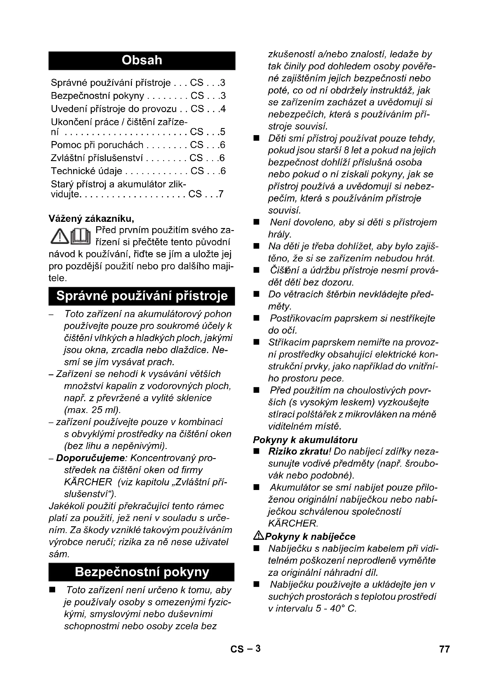 3,6 V Készülék névleges telje- sítménye 12 W Töltési idő üres akkunál 2 h Töltőkészülék kiindulási feszültsége 5,5 V Töltőkészülék kimeneti áram 600 mA Hangnyomásszint (EN 60704-2-1) 54 dB(A) Súly 0,7 kg Akku típus Li-Ion 75HU– 7 Ez a készülék beépített akkumulátort tartal- maz, a használt készülék eltávolítása előtt ezt ki kell szerelni. Rövidzárlat veszélye Ne érintsen meg érintkezéseket vagy vezetékeket. Robbanásveszély Az akkumulátort ne tegye ki erős nap- sütésnek, melegnek valamint tűznek. Sérülésveszély rövidzárlat, marásve- szély vagy izgató hatású gőzök kilé- pése miatt Ne nyissa ki az akkumulátort. A készüléket csak az akkumulátor eltá- volítása érdekében szabad kinyitni. Vegye ki az akkumulátort és környezet- barát módon távolítsa el (gyűjtőhelyen vagy a kereskedőnél). A használt készülék és az akkumulátor eltávolítása Akkumulátorok kiszerelése és ártalmatlanítása 76 HU– 3 Vážený zákazníku, Před prvním použitím svého za- řízení si přečtěte tento původní návod k používání, řiďte se jím a uložte jej pro pozdější použití nebo pro dalšího maji- tele. – Toto zařízení na akumulátorový pohon používejte pouze pro soukromé účely k čištění vlhkých a hladkých ploch, jakými jsou okna, zrcadla nebo dlaždice. Ne- smí se jím vysávat prach. – Zařízení se nehodí k vysávání větších množství kapalin z vodorovných ploch, např. z převržené a vylité sklenice (max. 25 ml). – zařízení používejte pouze v kombinaci s obvyklými prostředky na čištění oken (bez lihu a nepěnivými). – Doporučujeme: Koncentrovaný pro- středek na čištění oken od firmy KÄRCHER (viz kapitolu „Zvláštní pří- slušenství“). Jakékoli použití překračující tento rámec platí za použití, jež není v souladu s urče- ním. Za škody vzniklé takovým používáním výrobce neručí; rizika za ně nese uživatel sám. Toto zařízení není určeno k tomu, aby je používaly osoby s omezenými fyzic- kými, smyslovými nebo duševními schopnostmi nebo osoby zcela bez zkušeností a/nebo znalostí, ledaže by tak činily pod dohledem osoby pověře- né zajištěním jejich bezpečnosti nebo poté, co od ní obdržely instruktáž, jak se zařízením zacházet a uvědomují si nebezpečích, která s používáním pří- stroje souvisí. Děti smí přístroj používat pouze tehdy, pokud jsou starší 8 let a pokud na jejich bezpečnost dohlíží příslušná osoba nebo pokud o ní získali pokyny, jak se přístroj používá a uvědomují si nebez- pečím, která s používáním přístroje souvisí. Není dovoleno, aby si děti s přístrojem hrály. Na děti je třeba dohlížet, aby bylo zajiš- těno, že si se zařízením nebudou hrát. Čišt ění a údržbu přístroje nesmí prová- dět děti bez dozoru. Do větracích štěrbin nevkládejte před- měty. Postřikovacím paprskem si nestříkejte do očí. Stříkacím paprskem nemiřte na provoz- ní prostředky obsahující elektrické kon- strukční prvky, jako například do vnitřní- ho prostoru pece. Před použitím na choulostivých povr- ších (s vysokým leskem) vyzkoušejte stírací polštářek z mikrovláken na méně viditelném místě. Pokyny k akumulátoru Riziko zkratu! Do nabíjecí zdířky neza- sunujte vodivé předměty (např. šroubo- vák nebo podobné). Akumulátor se smí nabíjet pouze přilo- ženou originální nabíječkou nebo nabí- ječkou schválenou společností KÄRCHER. Pokyny k nabíječce Nabíječku s nabíjecím kabelem při vidi- telném poškození neprodleně vyměňte za originální náhradní díl. Nabíječku používejte a ukládejte jen v suchých prostorách s teplotou prostředí v intervalu 5 - 40° C. Obsah Správné používání přístroje . . . CS . . .3 Bezpečnostní pokyny . . . . . . . . CS . . .3 Uvedení přístroje do provozu . . CS . . .4 Ukončení práce / čištění zaříze- ní . . . . . . . . . . . . . . . . . . . . . . . CS . . .5 Pomoc při poruchách . . . . . . . . CS . . .6 Zvláštní příslušenství . . . . . . . . CS . . .6 Technické údaje . . . . . . . . . . . . CS . . .6 Starý přístroj a akumulátor zlik- vidujte. . . . . . . . . . . . . . . . . . . . CS . . .7 Správné používání přístroje Bezpečnostní pokyny 77CS– 4 Nikdy se nedotýkejte síťového kabelu mokrýma rukama. 몇 Pokyny k přepravě Akumulátor je otestován způsobem od- povídajícím relevantních předpisům pro mezinárodní přepravu a smí být převá- žen / zasílán. Obalové materiály jsou recyklovatel- né. Obal nezahazujte do domácího odpadu, nýbrž jej odevzdejte k opětovné- mu zužitkování. Staré přístroje obsahují hodnotné recyklovatelné materiály a látky, které se nesmí dostat do životního prostře- dí. Přístroj a zabudovaný akumulátor tudíž nesmíte likvidovat v domovním odpadu. Likvidaci můžete provést bezplatně pro- střednictvím místních vratných a sběrných systémů. Informace o obsažených látkách (RE- ACH) Aktuální informace o obsažených látkách naleznete na adrese: www.kaercher.com/REACH Nebezpečí! Pro bezprostředně hrozící nebezpečí, které vede k těžkým fyzickým zraněním nebo k smrti. 몇 Upozornění Pro potencionálně nebezpečnou situaci, která by mohla vést k těžkým fyzickým zra- něním nebo k smrti. Pozor Pro potencionálně nebezpečnou situaci, která může vést k lehkým fyzickým zraně- ním nebo k věcným škodám. Při vybalení zkontrolujte obsah zásilky, zda nechybí příslušenství či zda dodaný přístroj není poškozen. Při škodách způsobených dopravou informujte laskavě Vašeho ob- chodníka. ilustrace viz stránka 2 Obrázek 1 Nabíječka s nabíjecím kabelem 2 Základní zařízení 3 Nabíjecí zdířka 4 Ukazatel nabíjení / provozu