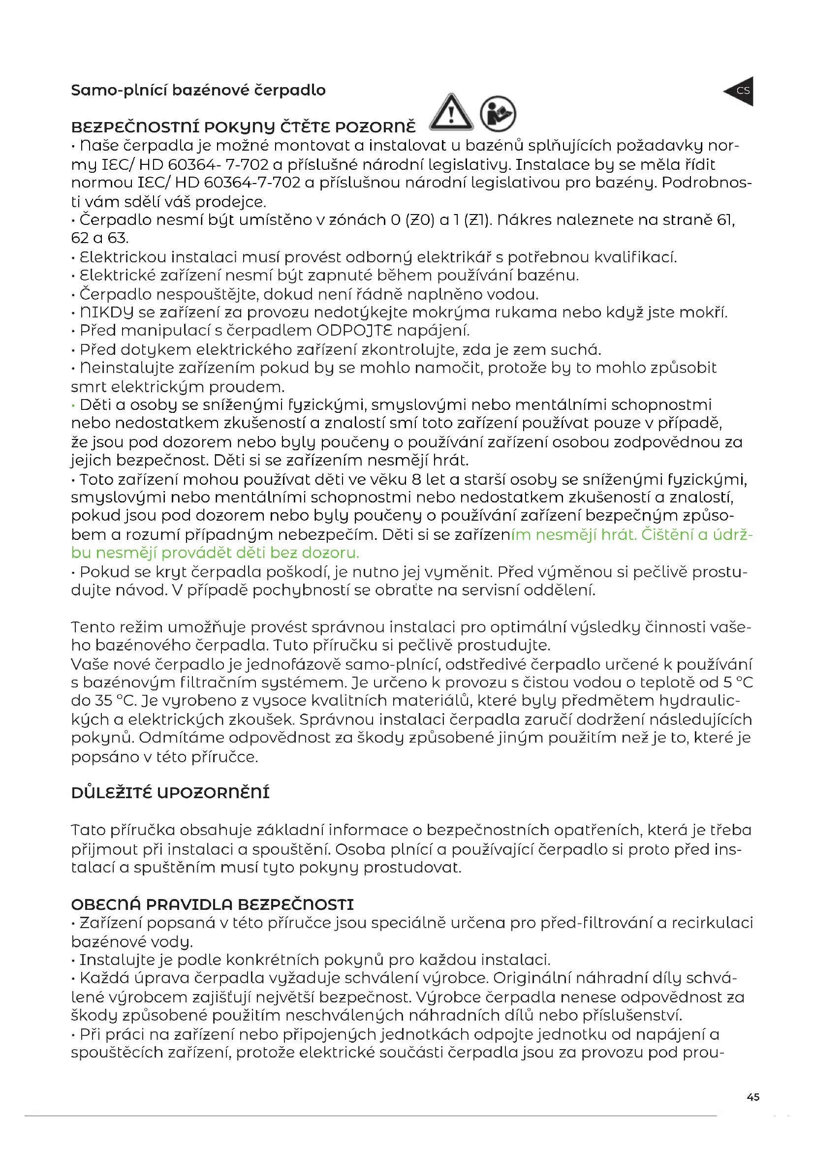 - Naše čerpadla je možné montovat a instalovat u bazénů splňujících požadavky nor- my IEC/ HD 60364- 7-702 a příslušné národní legislativy. Instalace by se měla řídit normou IEC/ HD 60364-7-702 a příslušnou národní legislativou pro bazény. Podrobnos- ti vám sdělí váš prodejce.