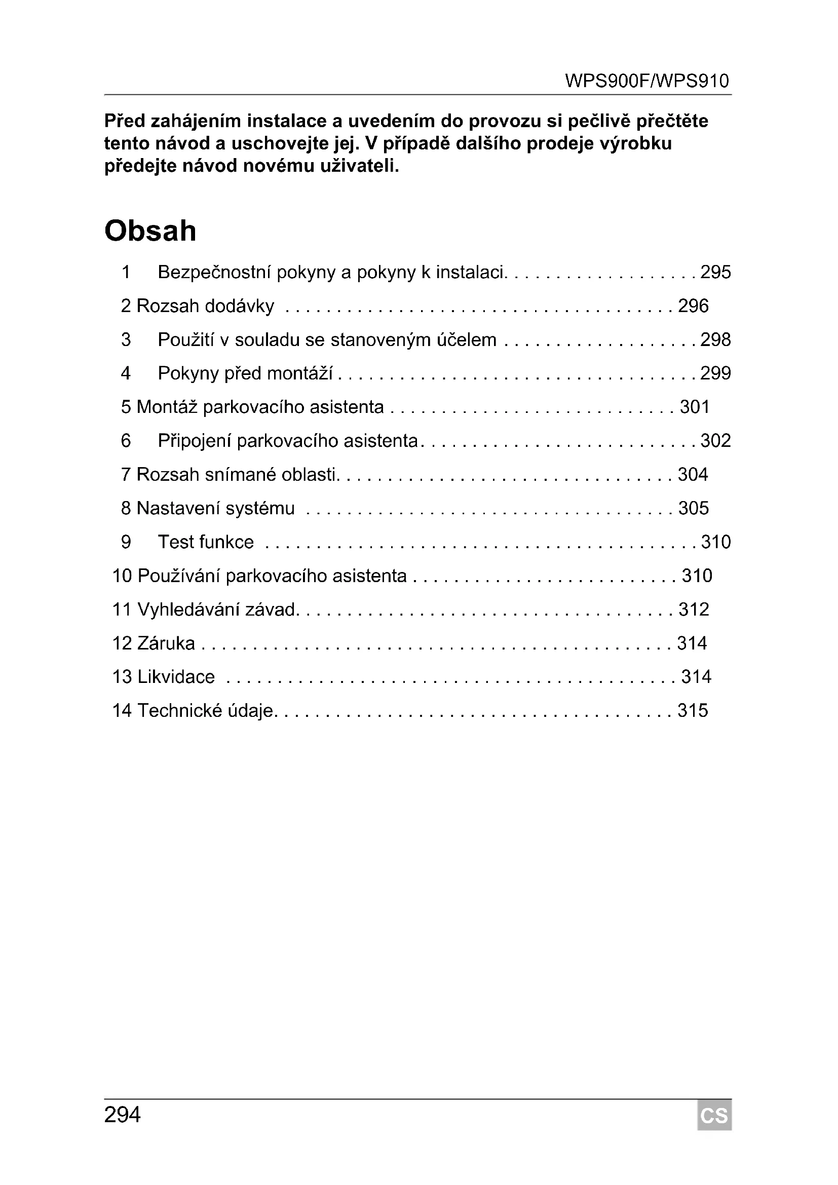 - 14 Technické údaje CS WPS900F/WPS910 Bezpečnostní pokyny a pokyny k instalaci p. 315