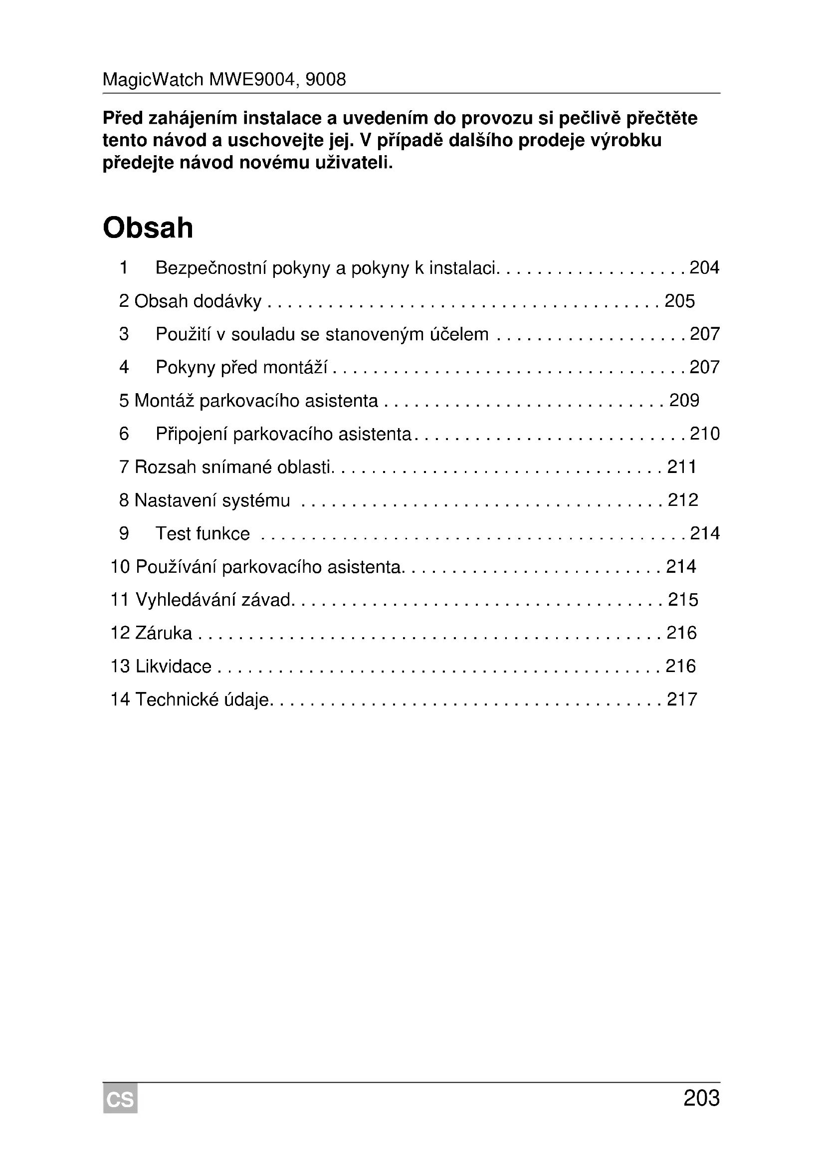 - Před zahájením instalace a uvedením do provozu si pečlivě přečtěte tento návod a uschovejte jej. V případě dalšího prodeje výrobku předejte návod novému uživateli. Obsah 1 Bezpečnostní pokyny a pokyny k instalaci p. 204