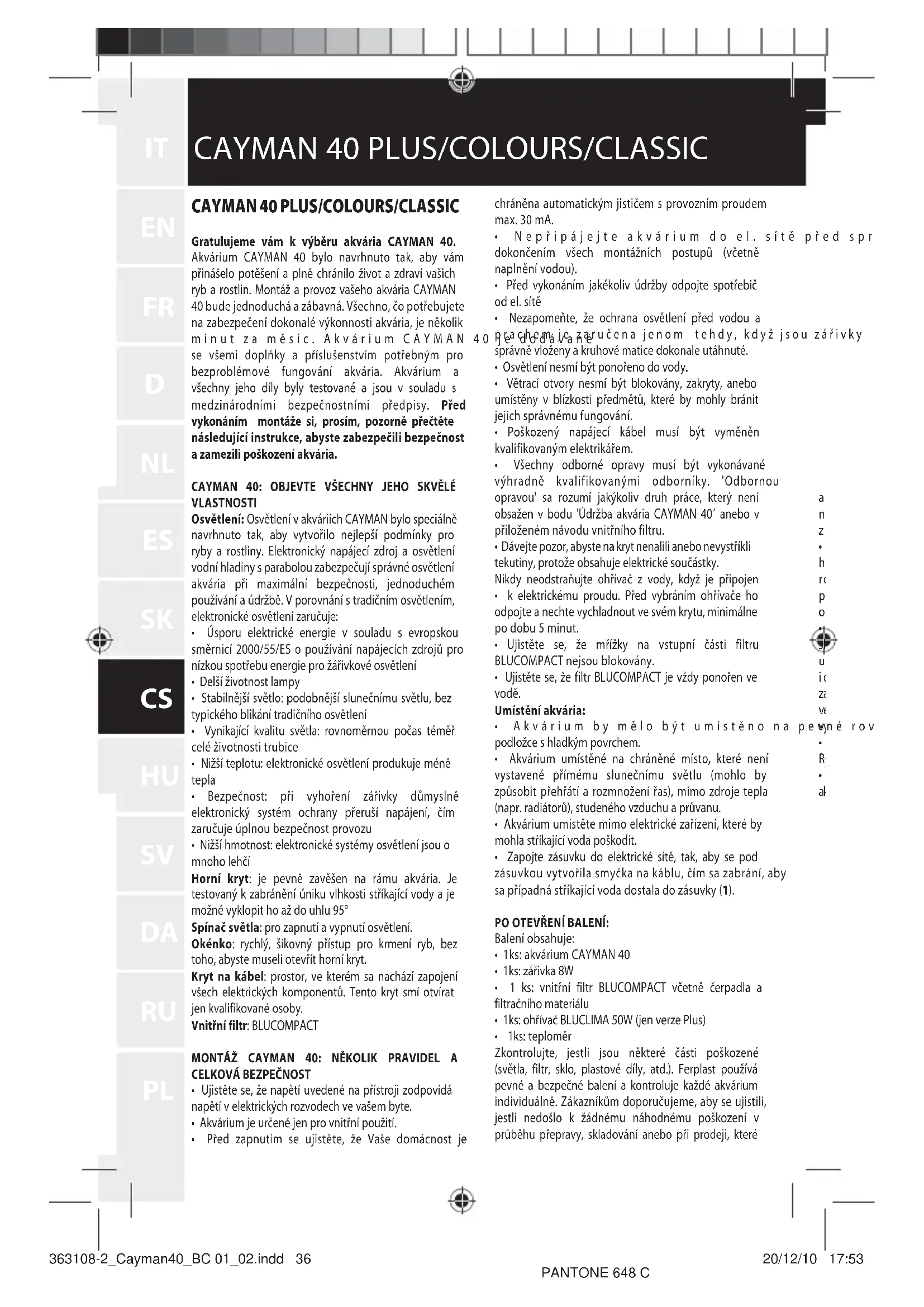 Ferplast poskytuje zaru na akvarium CAYMAN 40 jako i vsechny jeho dily a prislustensti stanovené v totom odstavci podle v soucasnosti platnych pravnich prdepisu. Zaru se vztahuje jenom na vyrobni chbya poskytnuti bezplatne opravy anebo ymemy. Zaru se nevztahuje na poskozeni a/anebo vady zpusobene nedbalosti, opotbrebovanim, pouzivanim v Rozporu sPokyny a upozorneni miv tefo piriucce, urazy, nevodnou manipulaci, nesprvnym pouzivanim, neodbornymi opravami a nakupem, ktery neni podlozeny dokladom. Na zarivky, starter (pokud je soucasti), houby a filtracni materialy sa zaruka nevztahuje.
