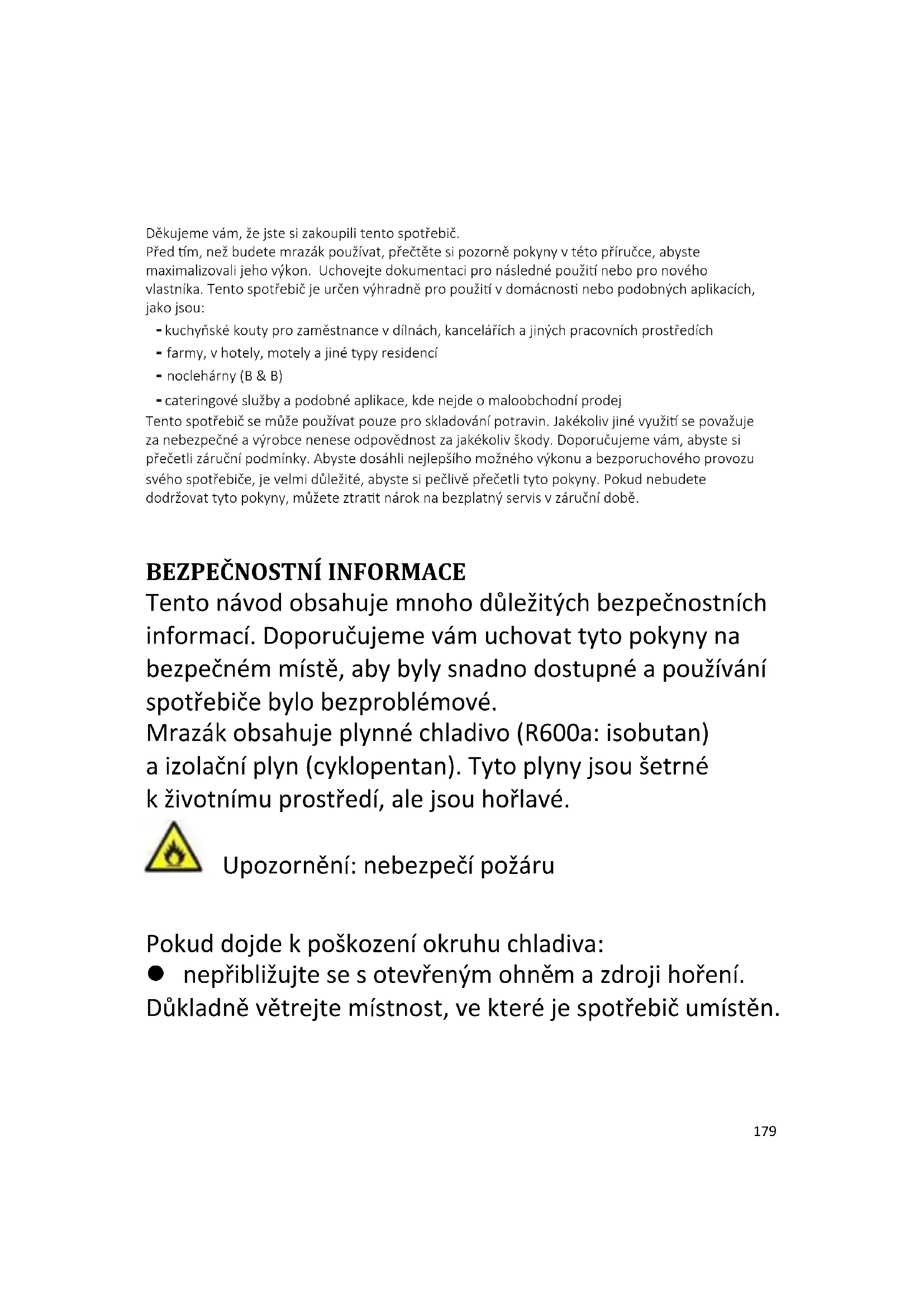 Tento návod obsahuje mnoho důležitých bezpečnostních informací. Doporučujeme vám uchovat tyto pokyny na bezpečném místě, aby byly snadno dostupné a používání spotřebiče bylo bezproblémové. Mrazák obsahuje plynné chladivo (R600a: isobutan) a izolační plyn (cyklopentan). Tyto plyny jsou šetrné k životnímu prostředí, ale jsou hořlavé. Upozornění: nebezpečí požáru Pokud dojde k poškození okruhu chladiva: nepřibližujte se s otevřeným ohněm a zdroji hoření. Důkladně větrejte místnost, ve které je spotřebič umístěn.180