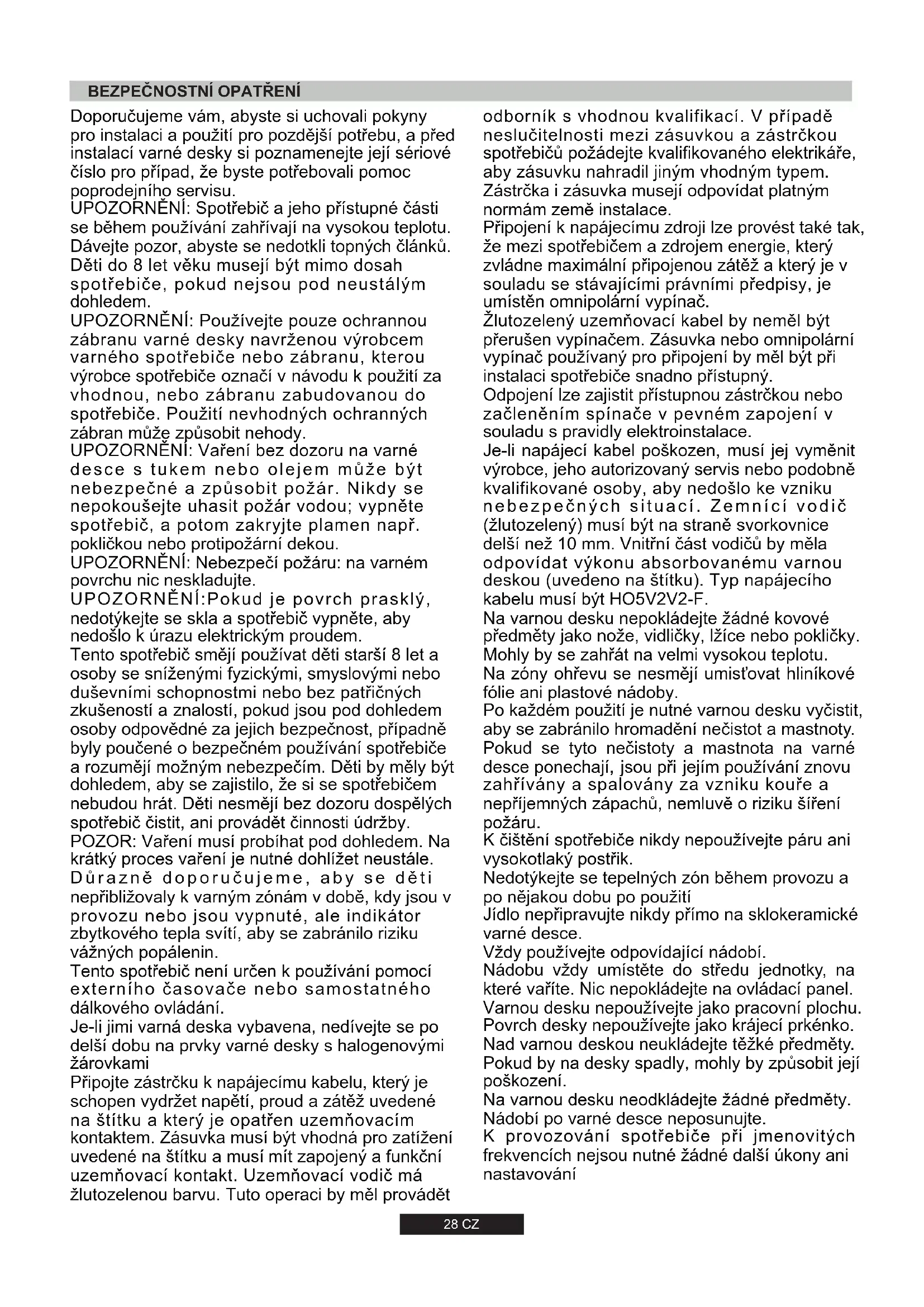 28 CZ odborník s vhodnou kvalifikací. V případě neslučitelnosti mezi zásuvkou a zástrčkou spotřebičů požádejte kvalifikovaného elektrikáře, aby zásuvku nahradil jiným vhodným typem. Zástrčka i zásuvka musejí odpovídat platným normám země instalace. Připojení k napájecímu zdroji lze provést také tak, že mezi spotřebičem a zdrojem energie, který zvládne maximální připojenou zátěž a který je v souladu se stávajícími právními předpisy, je umístěn omnipolární vypínač. Žlutozelený uzemňovací kabel by neměl být přerušen vypínačem. Zásuvka nebo omnipolární vypínač používaný pro připojení by měl být při instalaci spotřebiče snadno přístupný. Odpojení lze zajistit přístupnou zástrčkou nebo začleněním spínače v pevném zapojení v souladu s pravidly elektroinstalace. Je-li napájecí kabel poškozen, musí jej vyměnit výrobce, jeho autorizovaný servis nebo podobně kvalifikované osoby, aby nedošlo ke vzniku nebezpečných situací. Zemnící vodič (žlutozelený) musí být na straně svorkovnice delší než 10 mm. Vnitřní část vodičů by měla odpovídat výkonu absorbovanému varnou deskou (uvedeno na štítku). Typ napájecího kabelu musí být HO5V2V2-F. Na varnou desku nepokládejte žádné kovové předměty jako nože, vidličky, lžíce nebo pokličky. Mohly by se zahřát na velmi vysokou teplotu. Na zóny ohřevu se nesmějí umisťovat hliníkové fólie ani plastové nádoby. Po každém použití je nutné varnou desku vyčistit, aby se zabránilo hromadění nečistot a mastnoty. Pokud se tyto nečistoty a mastnota na varné desce ponechají, jsou při jejím používání znovu zahřívány a spalovány za vzniku kouře a nepříjemných zápachů, nemluvě o riziku šíření požáru. K čištění spotřebiče nikdy nepoužívejte páru ani vysokotlaký postřik. Nedotýkejte se tepelných zón během provozu a po nějakou dobu po použití Jídlo nepřipravujte nikdy přímo na sklokeramické varné desce. Vždy používejte odpovídající nádobí. Nádobu vždy umístěte do středu jednotky, na které vaříte. Nic nepokládejte na ovládací panel. Varnou desku nepoužívejte jako pracovní plochu. Povrch desky nepoužívejte jako krájecí prkénko. Nad varnou deskou neukládejte těžké předměty. Pokud by na desky spadly, mohly by způsobit její poškození. Na varnou desku neodkládejte žádné předměty. Nádobí po varné desce neposunujte. K provozování spotřebče přjmenovtých frekvencích nejsou nutné žádné další úkony an nastavováníNechte mezi varnou deskou a zadní stěnou mezeru nejméně 55 mm a mezi varnou deskou a vertikálním nábytkem nebo stěnami na boční straně nejméně 150 mm. Pokud je nad varnou deskou instalován nábytek, požadovaná minimální vzdálenost je 700 mm. Při instalaci odsavače par nad varnou desku se řiďte požadavky na instalaci odsavače par, ale v žádném případě nesmí být vzdálenost mezi varnou deskou a odsavačem par kratší než 700 mm.