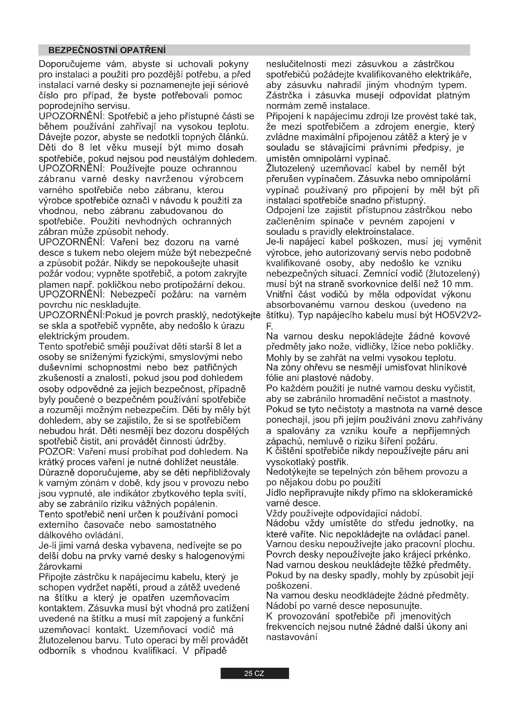 25 CZ Je-li napájecí kabel poškozen, musí jej vyměnit výrobce, jeho autorizovaný servis nebo podobně kvalifikované osoby, aby nedošlo ke vzniku nebezpečných situací. Zemnící vodič (žlutozelený) musí být na straně svorkovnice delší než 10 mm. Vnitřní část vodičů by měla odpovídat výkonu absorbovanému varnou deskou (uvedeno na štítku). Typ napájecího kabelu musí být HO5V2V2-
