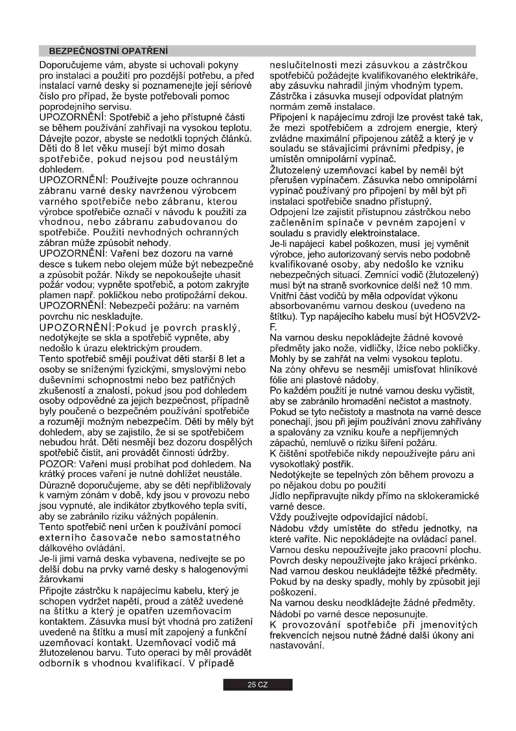 2CZ5 neslučitelnosti mezi zásuvkou a zástrčkou spotřebičů požádejte kvalifikovaného elektrikáře, aby zásuvku nahradil jiným vhodným typem. Zástrčka i zásuvka musejí odpovídat platným normám země instalace. Připojení k napájecímu zdroji lze provést také tak, že mezi spotřebičem a zdrojem energie, který zvládne maximální připojenou zátěž a který je v souladu se stávajícími právními předpisy, je umístěn omnipolární vypínač. Žlutozelený uzemňovací kabel by neměl být přerušen vypínačem. Zásuvka nebo omnipolární vypínač používaný pro připojení by měl být při instalaci spotřebiče snadno přístupný. Odpojení lze zajistit přístupnou zástrčkou nebo začleněním spínače v pevném zapojení v souladu s pravidly elektroinstalace. Je-li napájecí kabel poškozen, musí jej vyměnit výrobce, jeho autorizovaný servis nebo podobně kvalifikované osoby, aby nedošlo ke vzniku nebezpečných situací. Zemnící vodič (žlutozelený) musí být na straně svorkovnice delší než 10 mm. Vnitřní část vodičů by měla odpovídat výkonu absorbovanému varnou deskou (uvedeno na štítku). Typ napájecího kabelu musí být HO5V2V2-