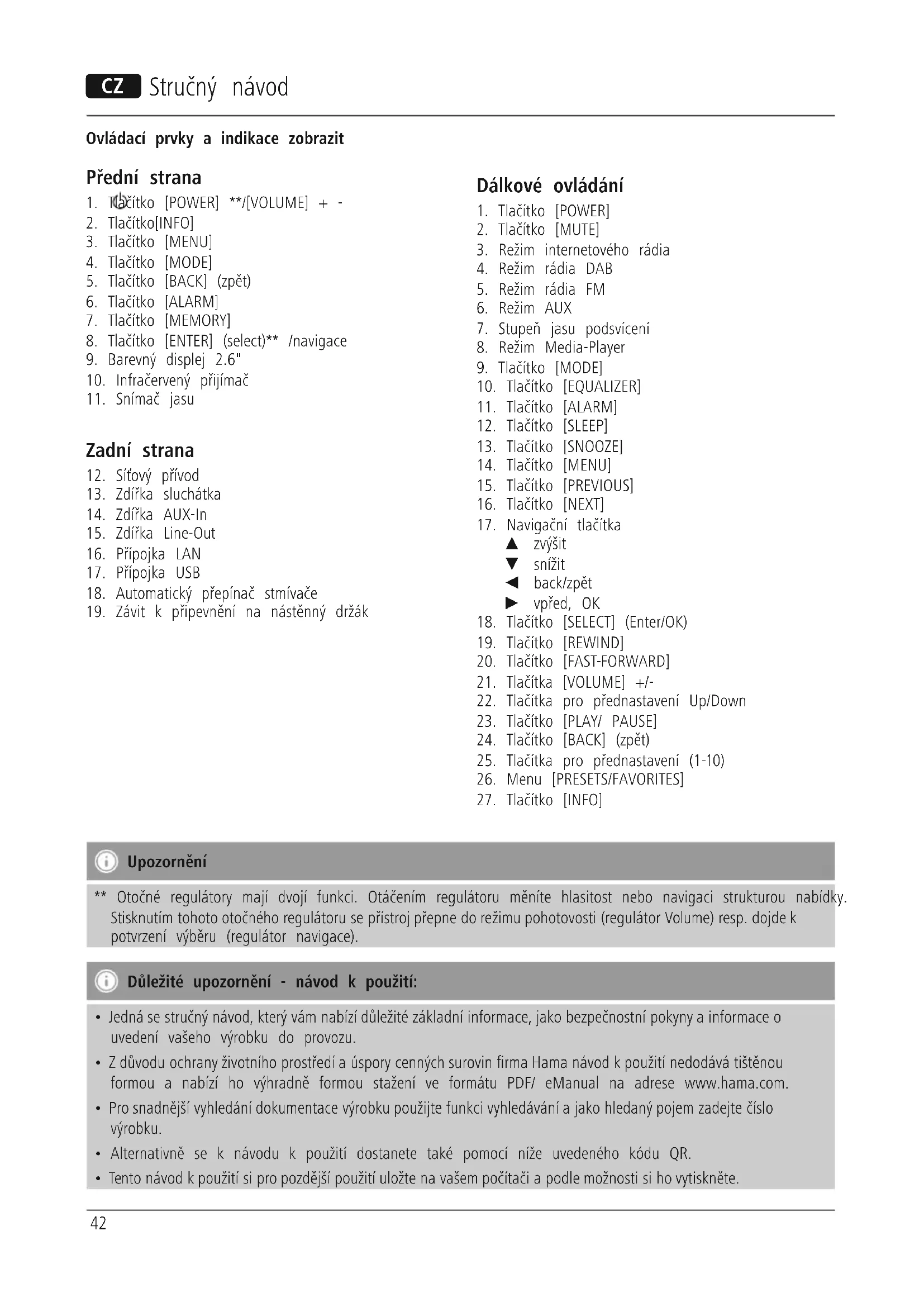 Upozornění ** Otočné regulátory mají dvojí funkci. Otáčením regulátoru měníte hlasitost nebo navigaci strukturou nabídky. Stisknutím tohoto otočného regulátoru se přístroj přepne do režimu pohotovosti (regulátor Volume) resp. dojde k potvrzení výběru (regulátor navigace). Důležité upozornění - návod k použití: